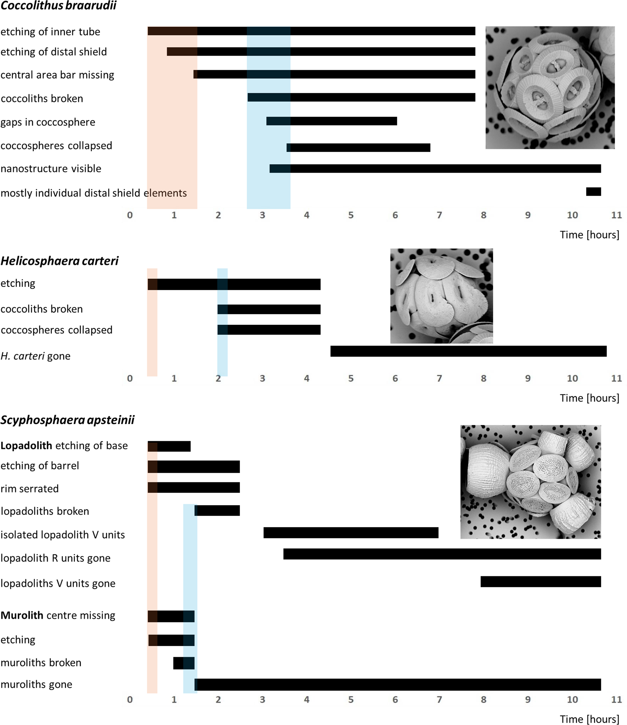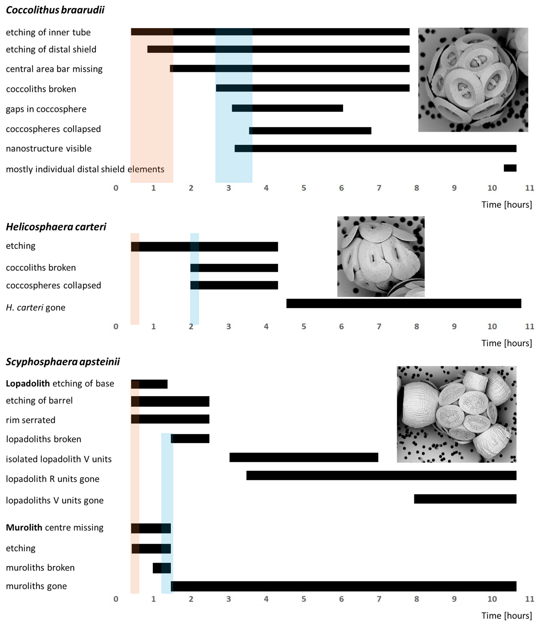 Figure 6Timelines of dissolution. Bars indicate the period during which the respective feature can be observed. Shaded backgrounds indicate the onset points of major features. Pink backgrounds indicate the onset of etching, blue backgrounds indicate the onset of breakage/collapse. For example-images of each feature see Figs. 1–5.
