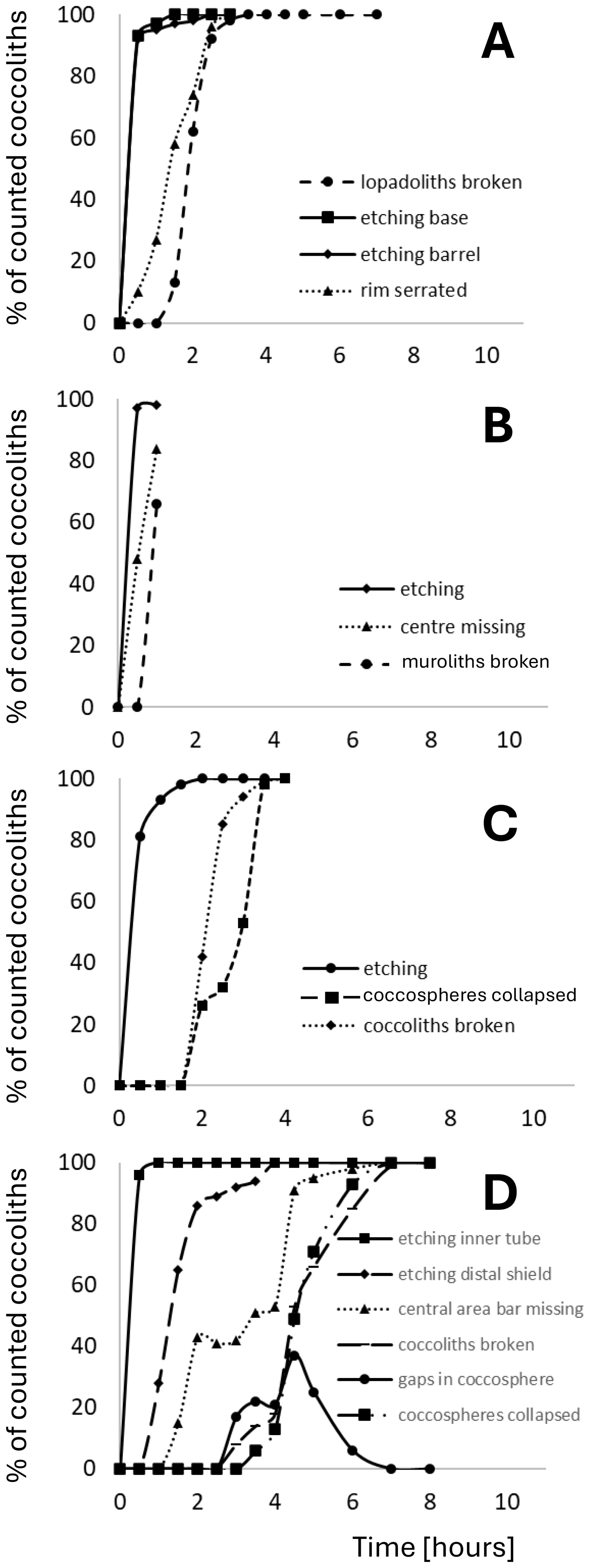 Figure 7Quantification of the observations illustrated in Fig 6. Plotted is the percentage of each analysed feature versus time in hours from start of experiment. (A) Scyphosphaera apsteinii lopadoliths (B) Scyphosphaera apsteinii muroliths (C) Helicosphaera carteri (D) Coccolithus braarudii.
