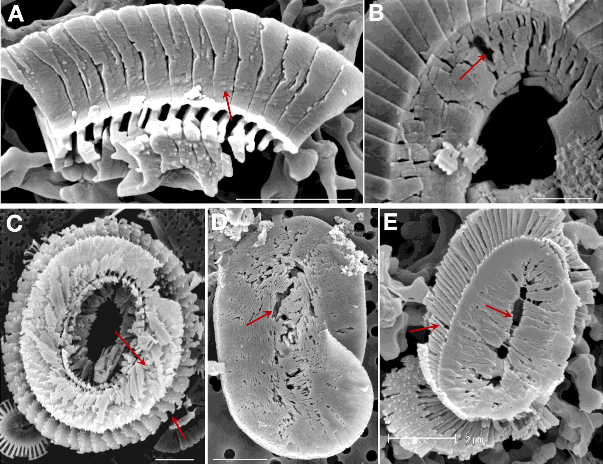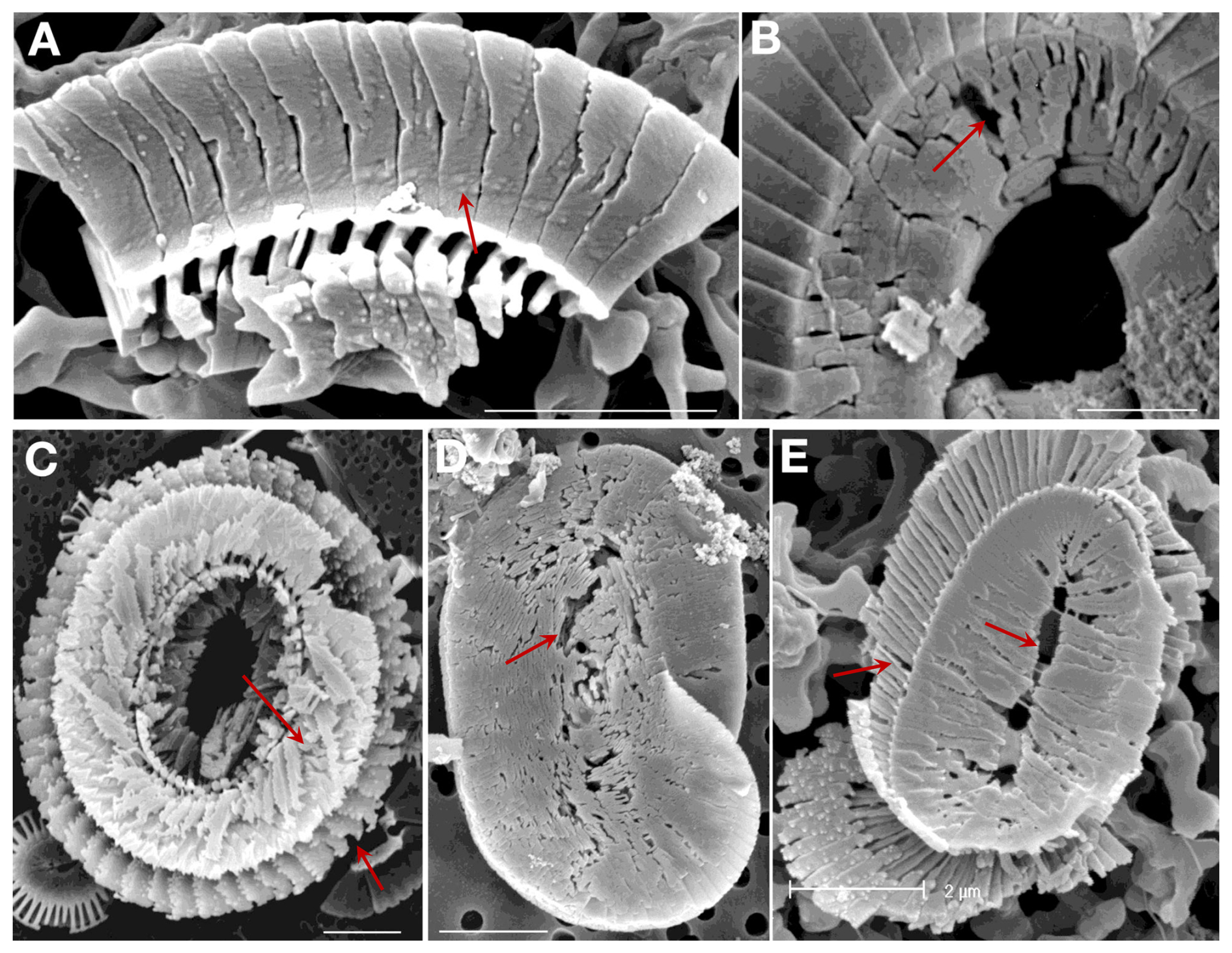 Figure 8Field samples showing etching patterns comparable to those seen in the experimental samples (arrows). All scale bars 2 µm. Coccolithus braarudii: (A) Lower surface of a broken piece of distal shield showing nanostructure. (B) Central area of distal shield showing early stage dissolution. (C) Proximal surface showing advanced dissolution. Helicosphaera carteri: (D) Distal Surface showing early stage dissolution. (E) Proximal surface showing advanced dissolution. (A, B) sediment trap samples from 3200 m, N. Atlantic; (C) surface water sample, NW Atlantic; (D) – sediment trap sample, Canaries, 200 m; (E) plankton sample from 120 m, Gulf of Mexico.