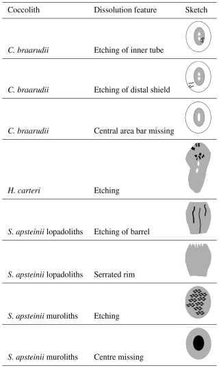 Based largely on field sediment studies, it is accepted that some coccolith forms dissolve faster than others. While G. huxleyi and Umbilicosphaera sibogae are among the fast-dissolving placolith bearing species, G. oceanica, C. leptoporus, and C. pelagicus are comparatively slow-dissolving (McIntyre and McIntyre, 1971; Berger, 1973; Roth and Coulbourn, 1982). These studies have not assessed how dissolution morphologies of different species relate to each other. In other words, which dissolution morphology of species x corresponds to a given dissolution morphology of species y?