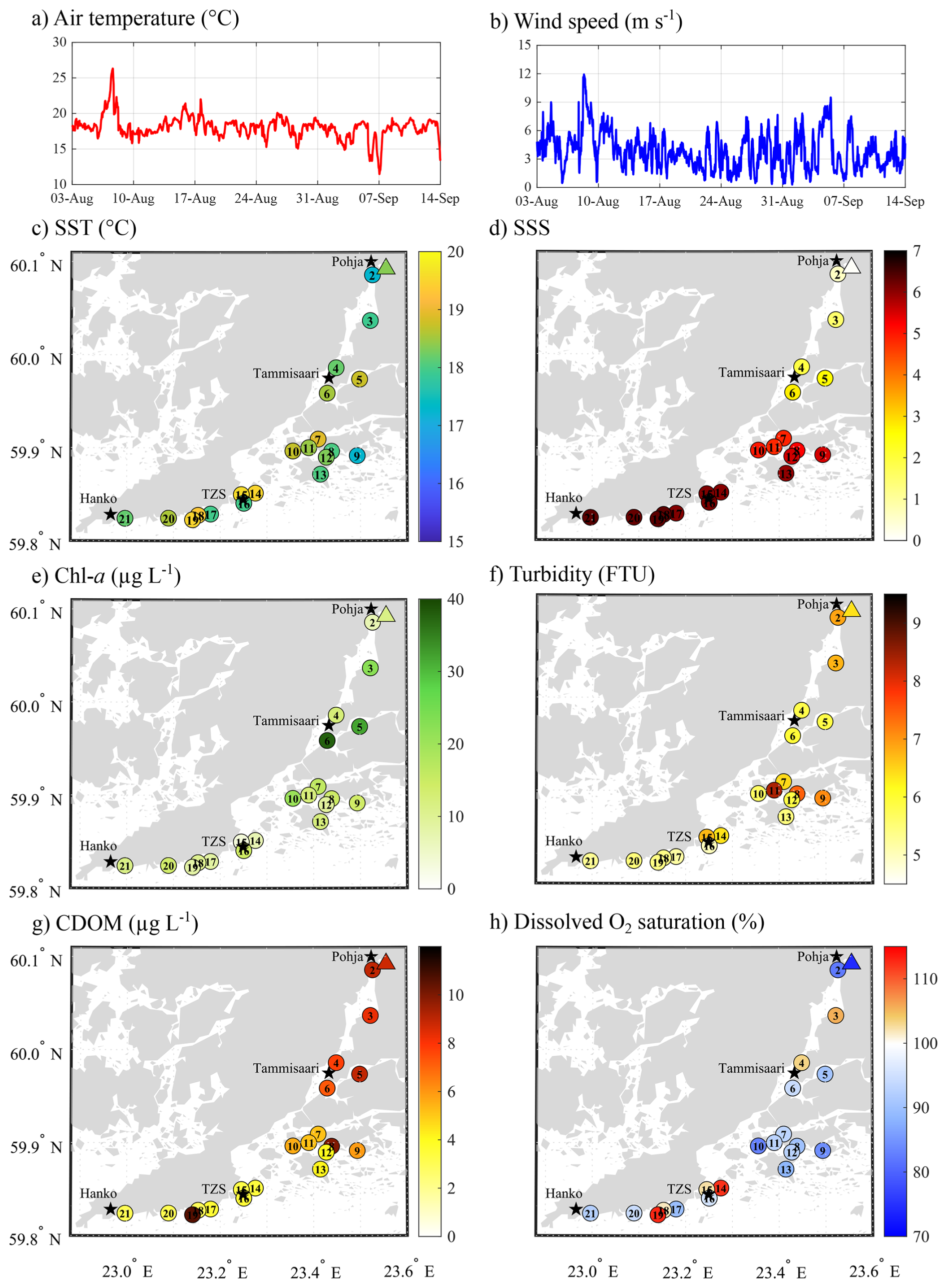 Figure 1Atmospheric conditions: (a) air temperature (°C) and (b) wind speed (m s−1) recorded at the ICOS station FI-Tvm established at the Tvärminne Zoological Station. Spatial variation of (c) surface seawater temperature (SST, °C), and (d) salinity (SSS), (e) chlorophyll a (chl a, µg L−1) concentration, (f) turbidity (FTU), (g) coloured dissolved organic matter (CDOM, µg L−1), and (h) dissolved oxygen saturation (%) across the sampling area. Triangles represent the surface water conditions at the mouth of the Karjaanjoki River.