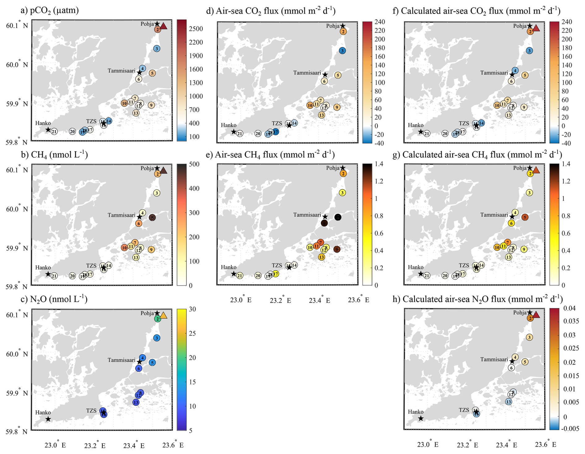 Figure 2Left column presents the spatial variation of surface seawater (a) pCO2 (µatm), (b) CH4 (nmol L−1), and (c) N2O concentration (nmol L−1). The middle column presents measured air-sea fluxes of (d) CO2 (mmol m−2 d−1) and (e) CH4 (mmol m−2 d−1). The right column presents the calculated air-sea fluxes of (f) CO2 (mmol m−2 d−1), (g) CH4 (mmol m−2 d−1), and (h) N2O (mmol m−2 d−1). Positive values indicate a release from the sea to the atmosphere, while negative values represent an uptake by the sea. Triangles represent the surface water conditions at the mouth of the Karjaanjoki River.