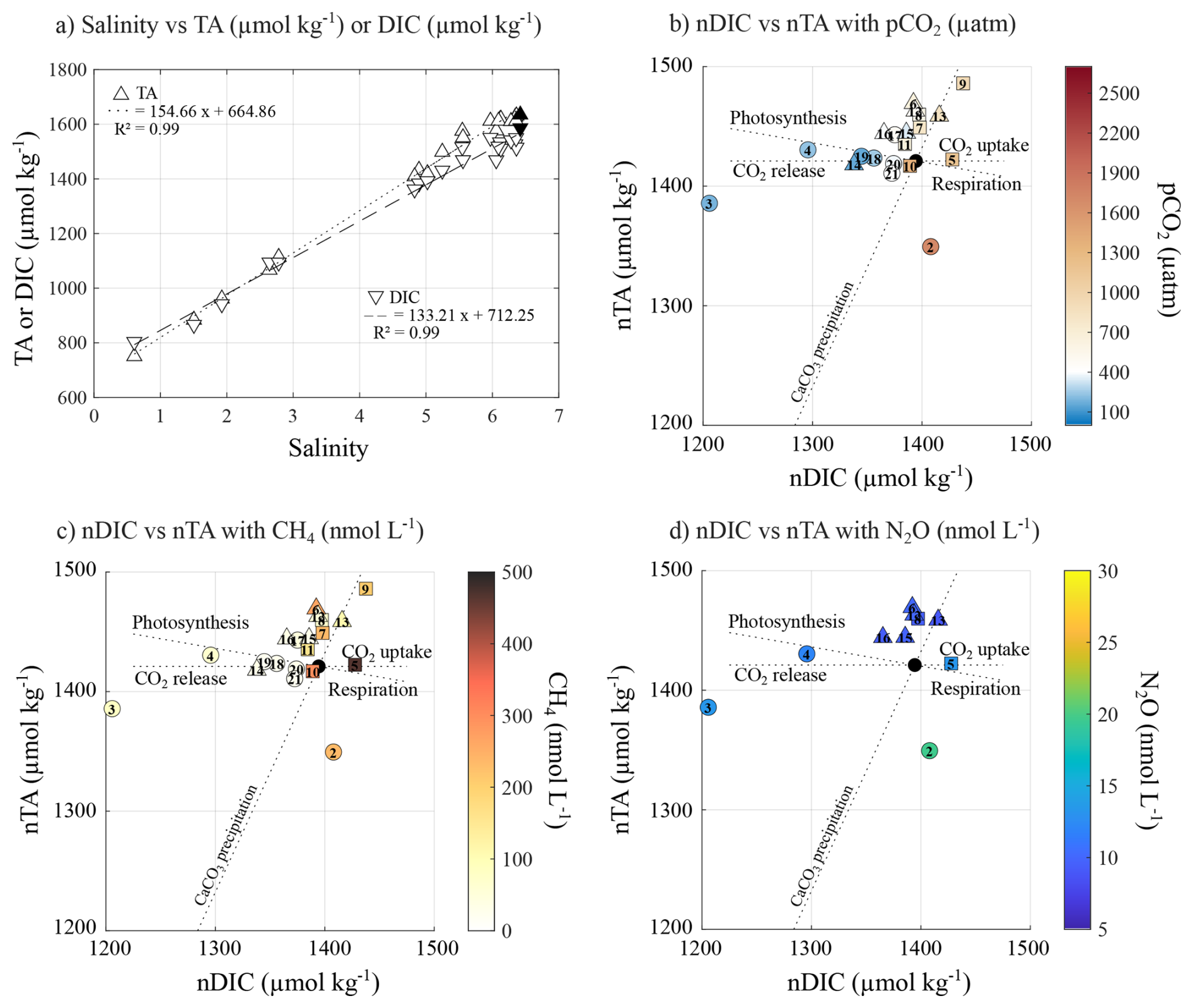 Figure 3(a) Relationship between salinity, TA (µmol kg−1, circles) and DIC (µmol kg−1, squares). Relationship between nDIC and nTA, and their association with (b) pCO2 (µatm), (c) CH4 (nmol L−1), and (d) N2O (nmol L−1) concentrations. Black symbols represent the seawater endmember. Exposed and semi-sheltered sites are represented by circles, while sheltered sites are represented by square symbols.