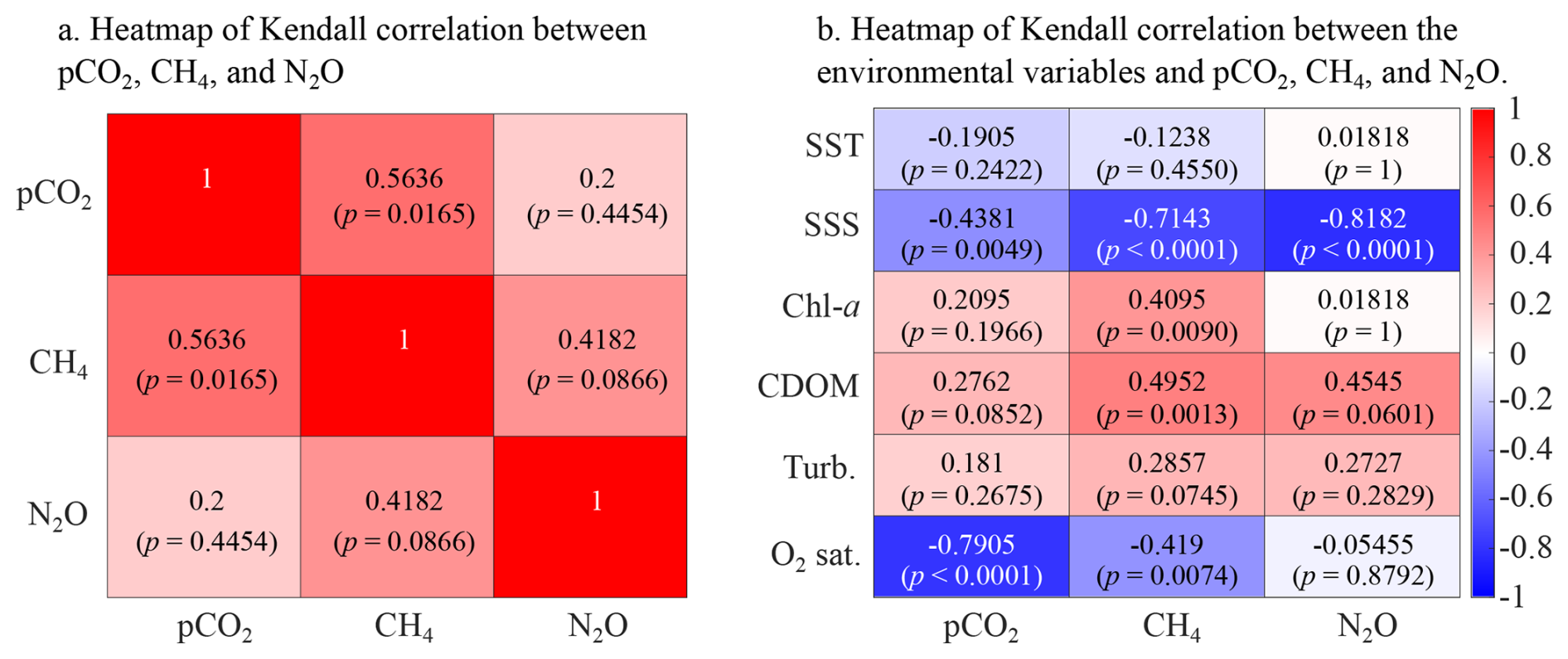 Figure 4Heatmap of Kendall correlation coefficient (a) between surface water pCO2, CH4, and N2O concentration, and (b) between main seawater biogeochemical properties (SST, SSS, chl a concentration, colored dissolved organic carbon, turbidity, and O2 saturation) and pCO2, CH4, and N2O concentration.