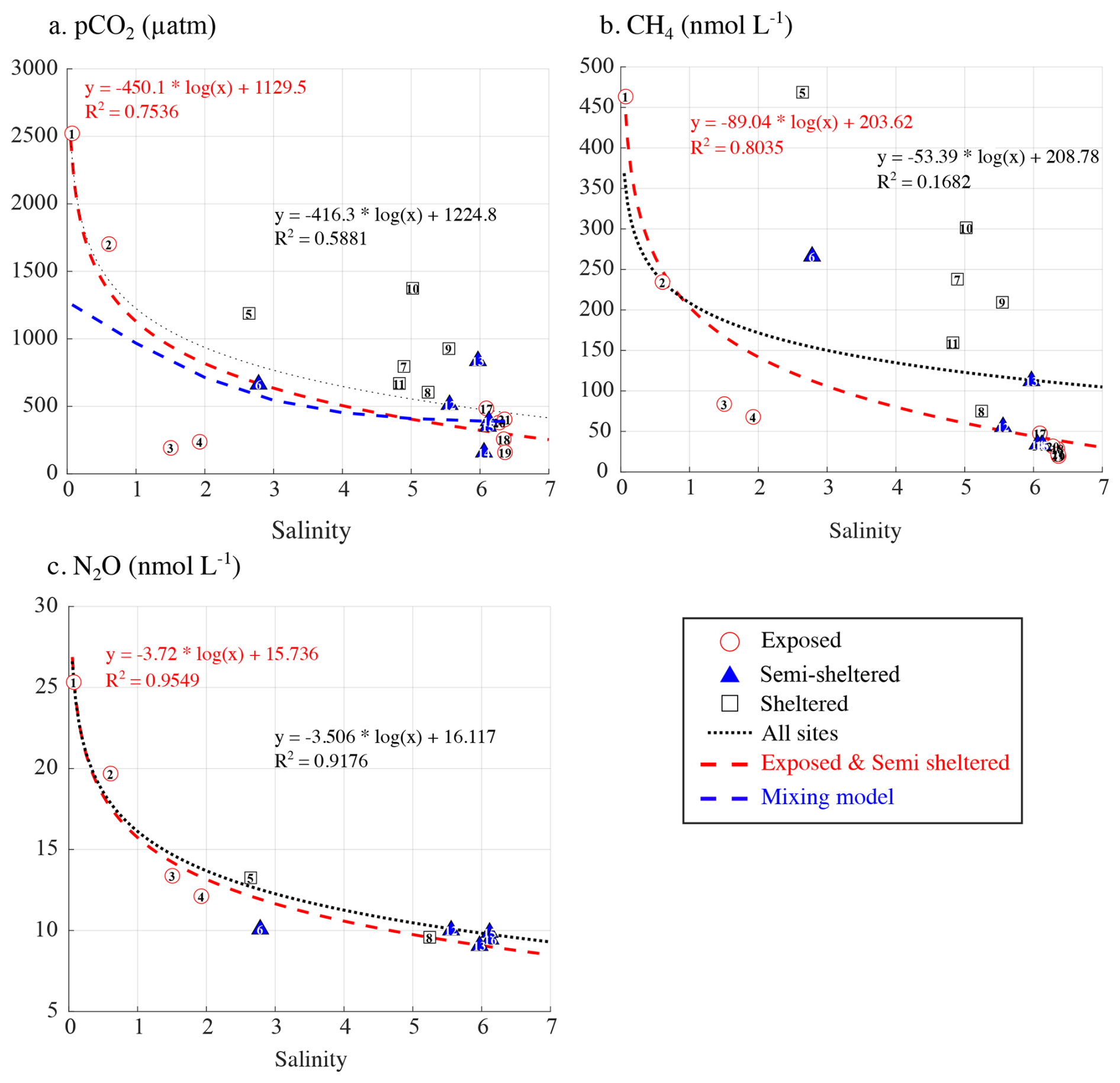 Figure 5Relationship between surface seawater salinity and (a) pCO2 (µatm), (b) CH4 (nmol L−1), and (c) N2O (nmol L−1) concentrations. In each panel, the dotted line represents the regression across all sites, while the red dashed line shows the regression limited to exposed and semi-sheltered sites. The blue line in panel (a) represents the estimated pCO2 resulting only from the mixing of the Karjaanjoki River water (S=0) with seawater (S=6.42).
