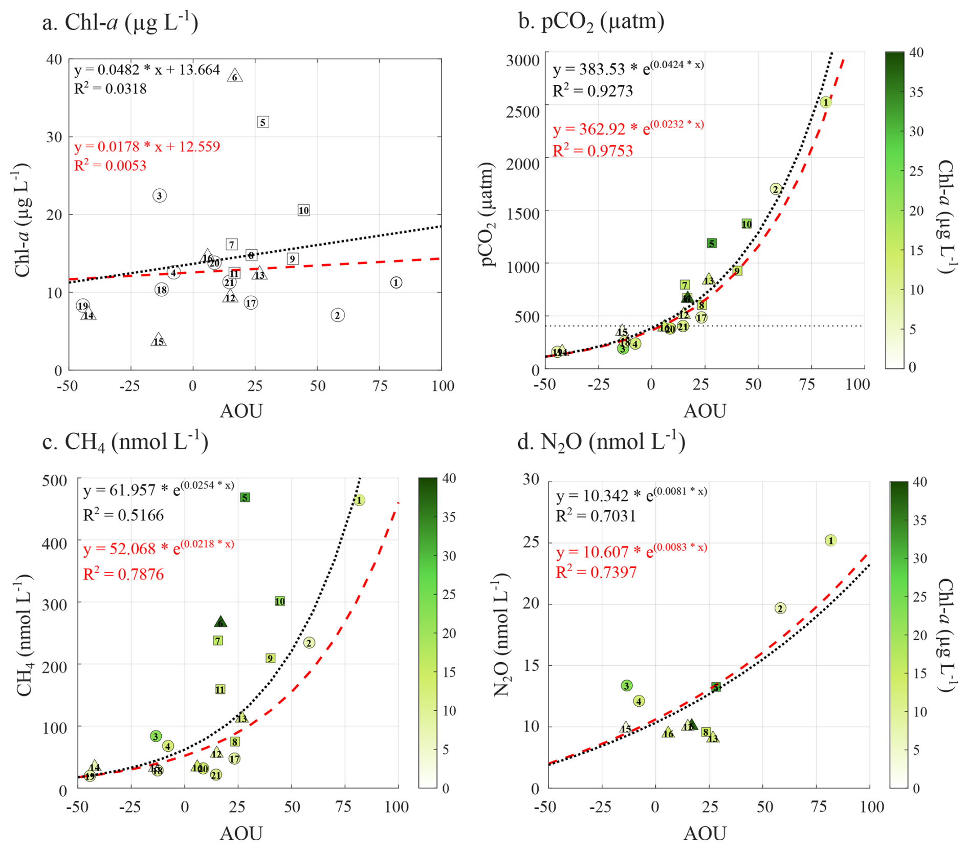 Figure 6Relationship between the apparent oxygen utilization (AOU) and (a) surface water Chl a concentration (µg L−1), (b) surface water pCO2 (in µatm), (c) CH4 (nmol L−1), and (d) N2O (nmol L−1) associated with the Chl a concentration (µg L−1). In each panel, the dotted line represents the regression across all sites, while the red dashed line shows the regression limited to exposed and semi-sheltered sites. Exposed and semi-sheltered sites are represented by circles, while sheltered sites are represented by square symbols.
