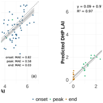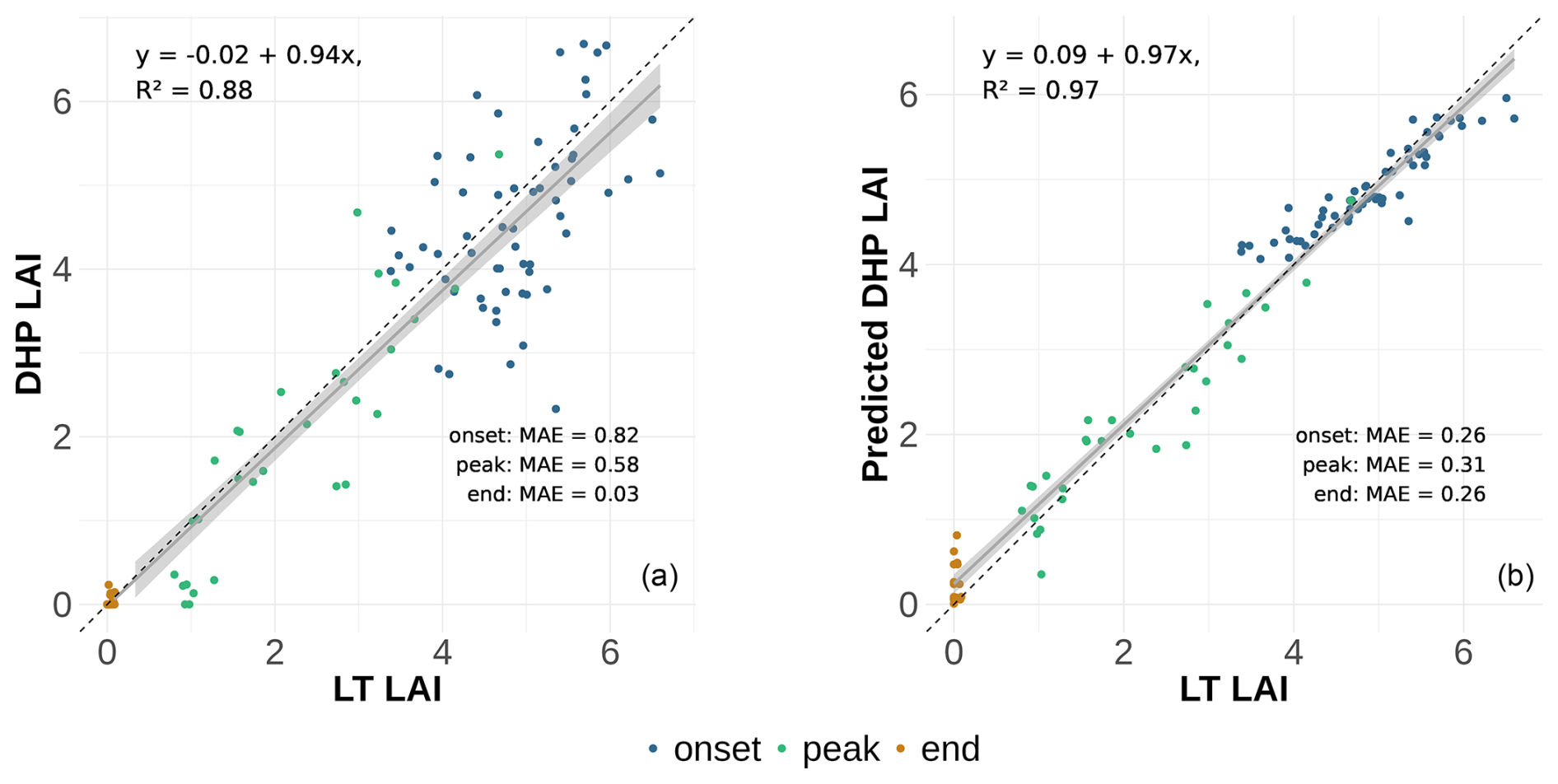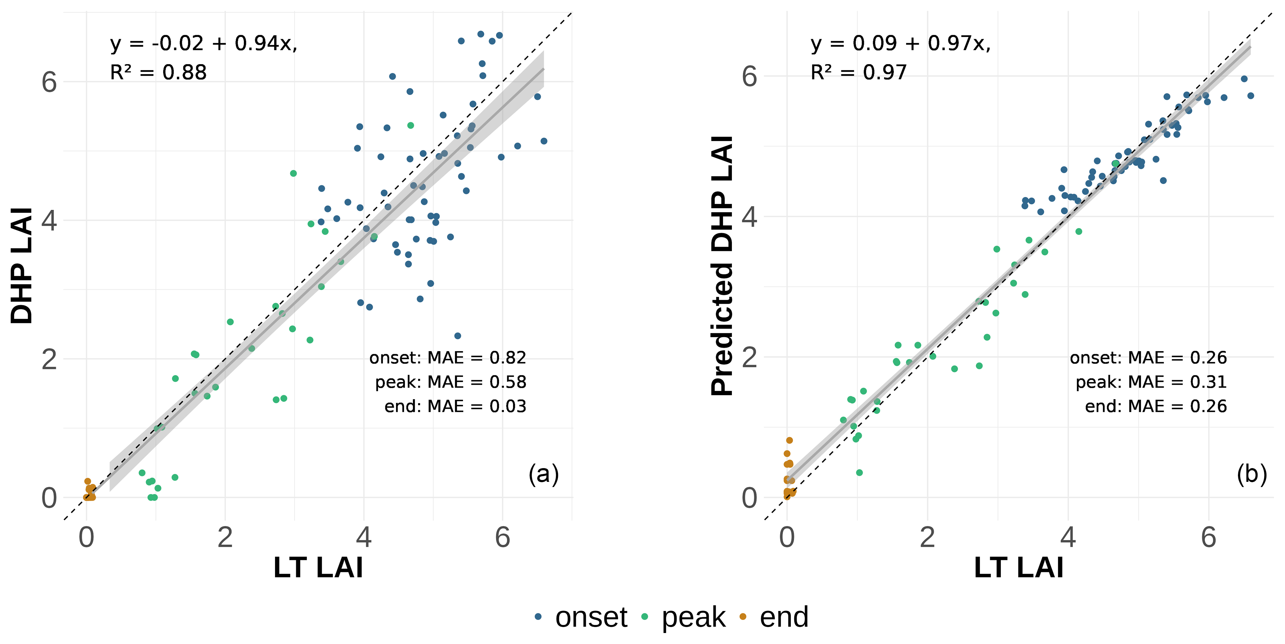 Figure 7(a) DHP-derived LAI using the clumping Index LXG1 for a View Zenith Angle of 20° against LT LAI. The sample points are colored according to the phase of leaf fall. The breakpoints for the leaf fall phases were determined using a breakpoint analysis and are shown in Fig. 4. Mean absolute errors (MAE) for each phase are displayed within the plot. (b) predicted LAI of the GLMM against the LT LAI, illustrating the improved accuracy of the location-specific calibration.