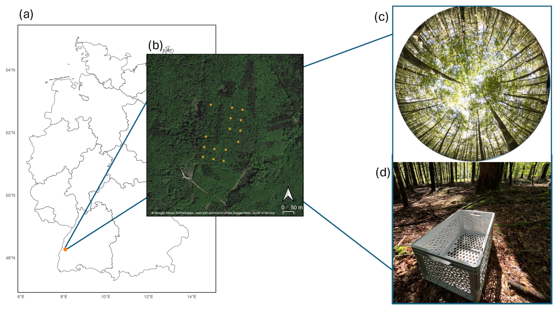 Figure 1(a) Geographical location of the study site in Germany, situated near Ettenheim at the ECOSENSE forest site (center coordinates: 48.2679° N, 7.8783° E). () Detailed map of the study area, illustrating the spatial distribution of sample points used for litter trap (LT) and digital hemispherical photography (DHP) overlaid on satellite imagery (©Google, Maxar Technologies, used in accordance with Google Maps/Earth Terms of Service: https://www.google.com/permissions/geoguidelines/, last access: 25 February 2026). (c) Representative DHP image captured prior to leaf fall. (d) Example of a litter trap installation at a sampling point.