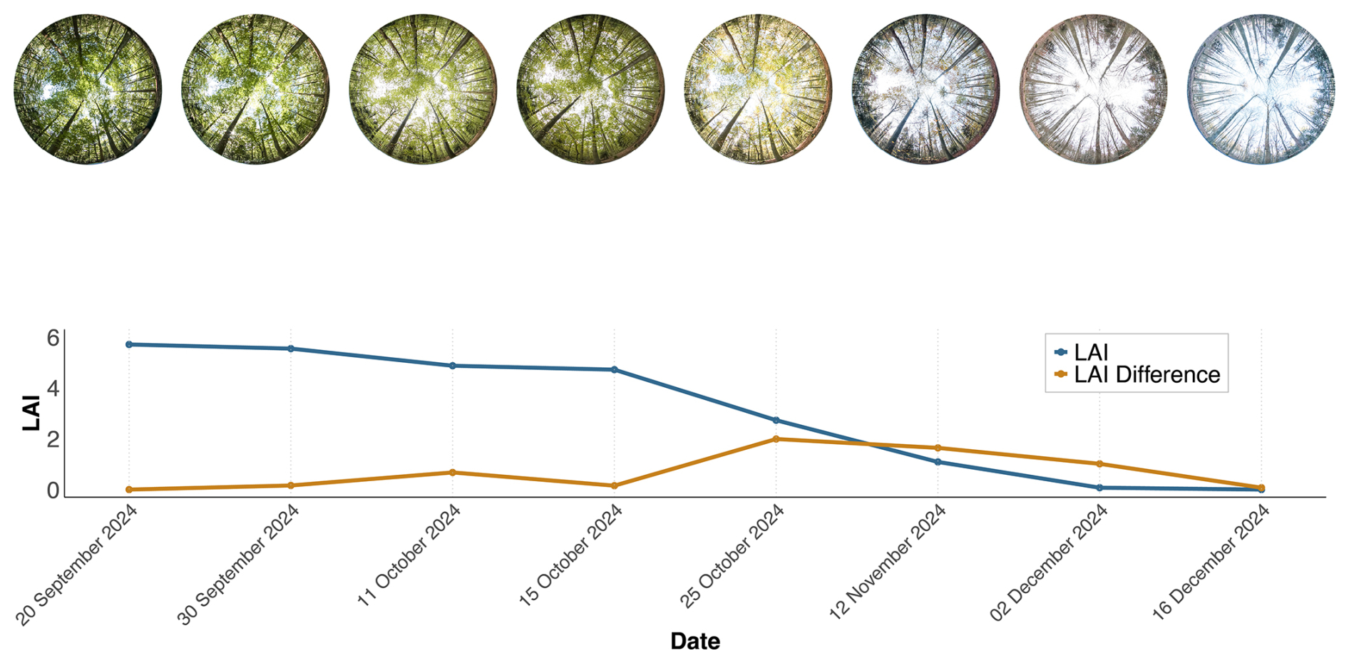 Figure 2Example of digital hemispherical photography (DHP) at a single sample point across all measurement dates. The blue line represents the cumulative litter trap (LT) LAI, and the brown line indicates the temporal rate of change (slope) of the blue curve, corresponding to the LAI difference between consecutive measurements. The cumulative LT LAI values start at 0 on 16 December 2024.