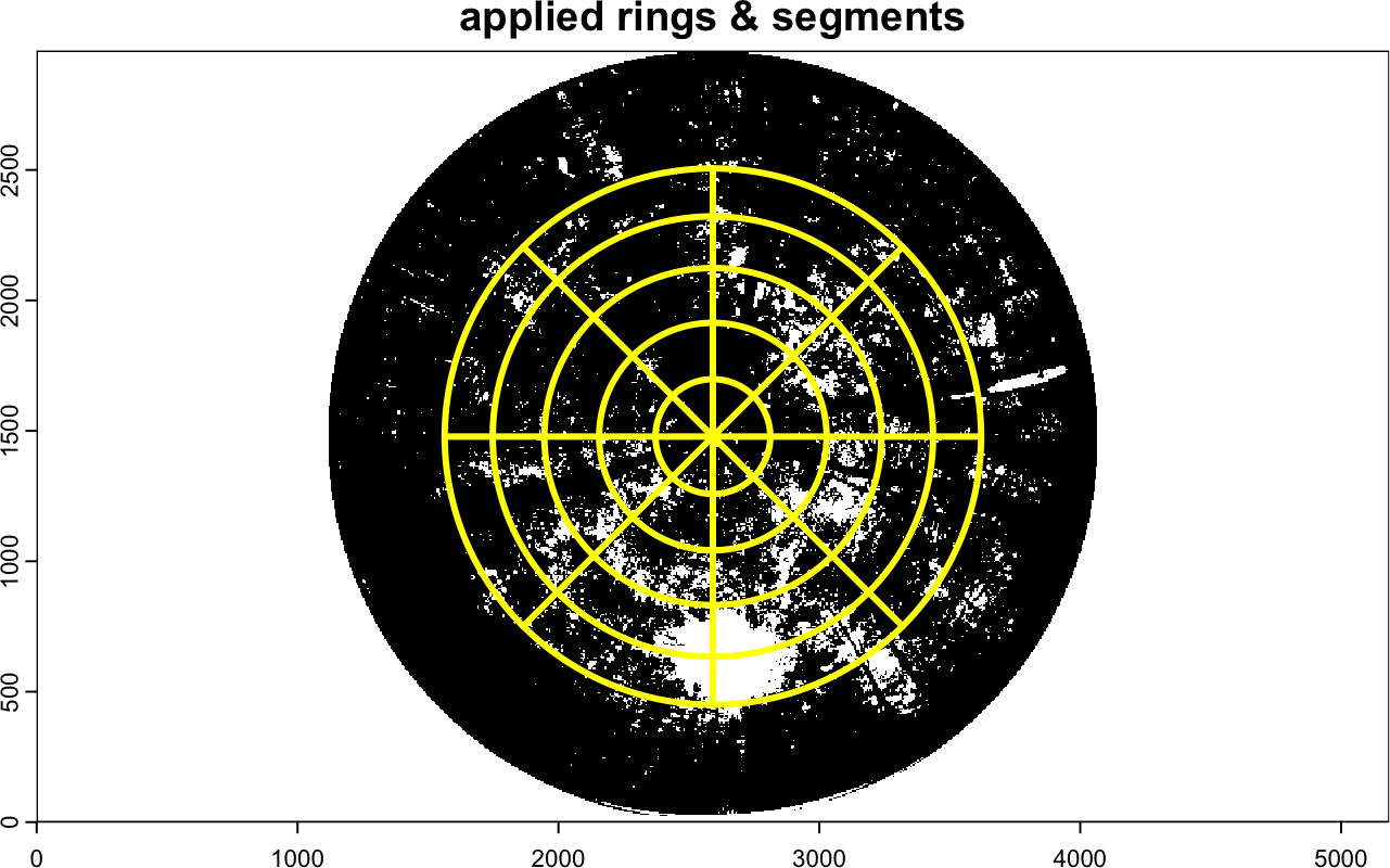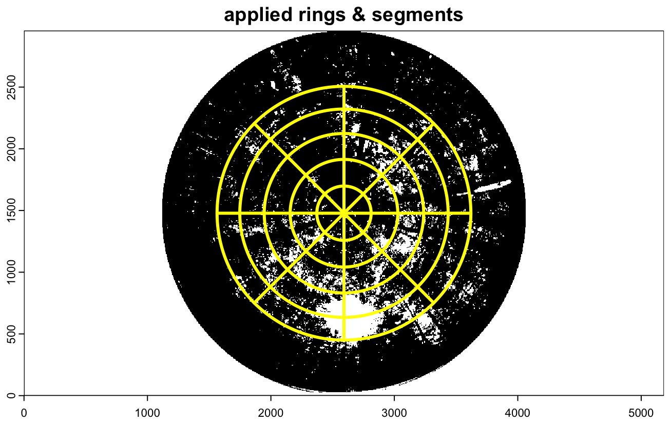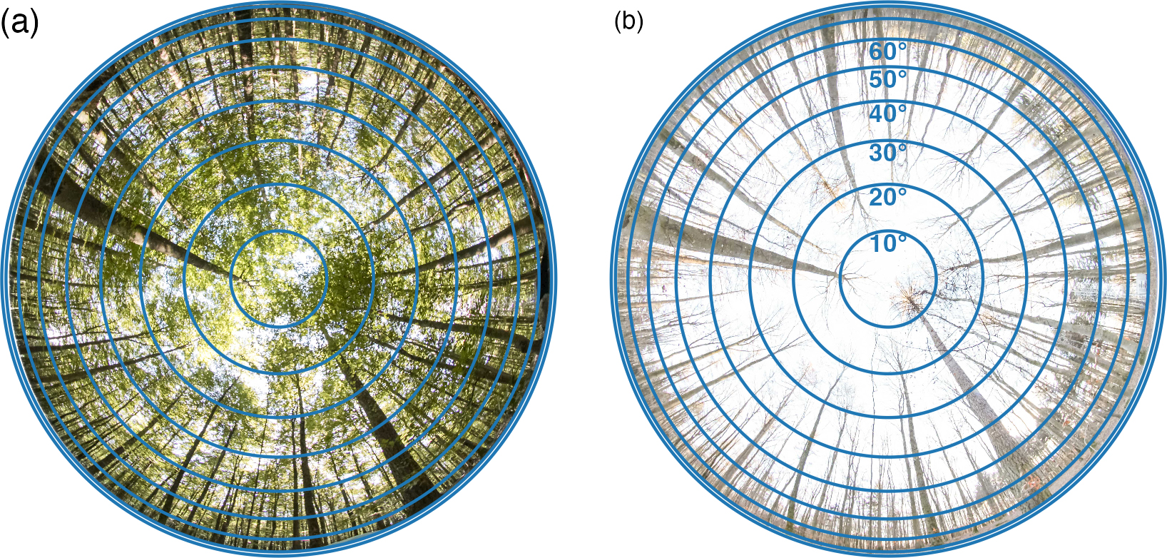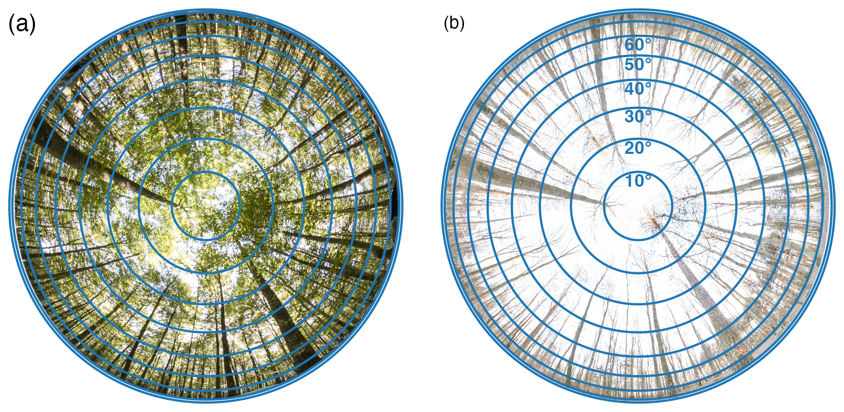 The DHP-based LAI retrieval was performed with five zenith rings and eight azimuth segments (Fig. A2). Chianucci et al. (2015) demonstrated that segmenting zenith rings into multiple azimuth sections accounts for non-random foliage distribution and improves estimation of clumping. Additionally, Chianucci and Cutini (2013) found that finer segmentation enhances gap fraction calculations, which is particularly important in dense canopies. While the optimal configuration remains uncertain, this setting represents a practical middle ground for reliable canopy structure assessment.