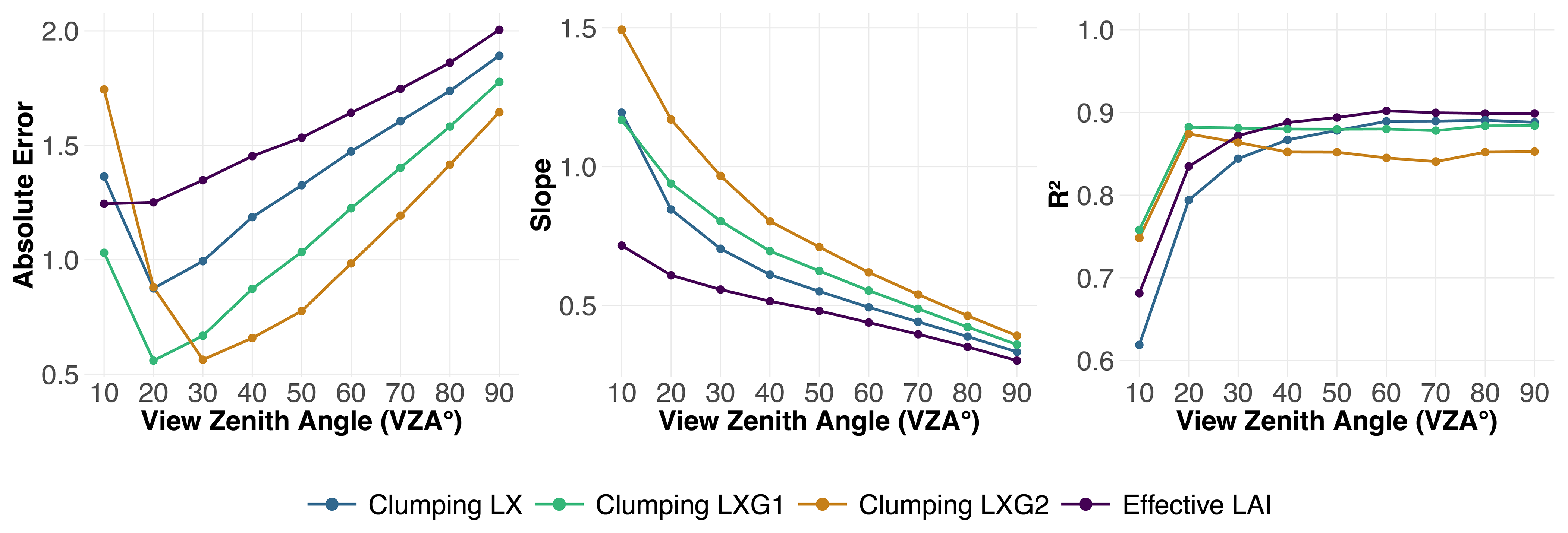 Figure 4Absolute error, slope, and R2 for DHP-derived LAI versus LT-derived LAI across all clumping indices (effective LAI without clumping) and view zenith angles (VZA) from 10 to 90°. The slope is derived from the linear regression between DHP-derived LAI and LT-derived LAI, indicating how the DHP estimates compare to the LT reference. The absolute error is calculated as the mean residual from the 1:1 line, representing the deviation of DHP estimates from the ideal agreement with LT-derived LAI. R2 quantifies the strength of this relationship. Data points represent computed values at each VZA, with lines connecting them to illustrate trends across different clumping indices.