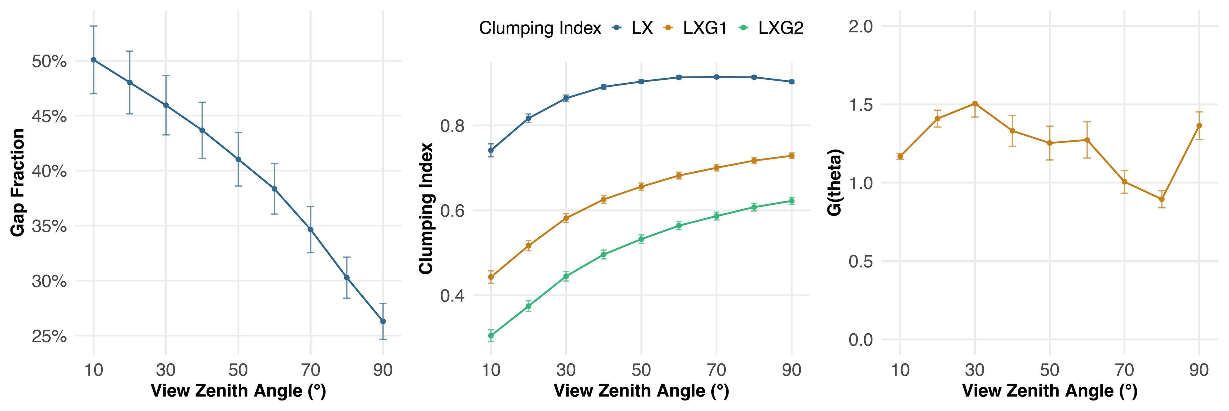 Figure 5Canopy structural parameters (gap fraction, clumping index, and projection function G(θ)) across view zenith angles (VZA). The relationship illustrates how canopy optical properties change with increasing VZA, showing potential confounders for DHP LAI estimation.