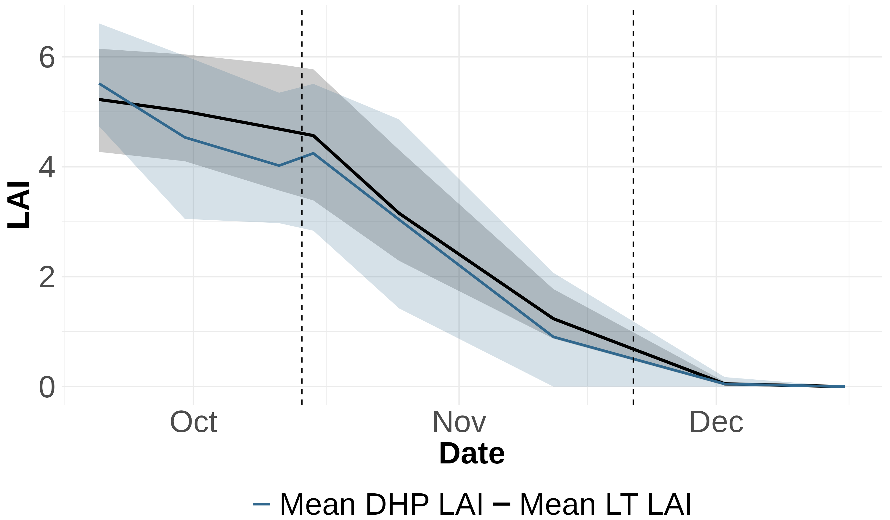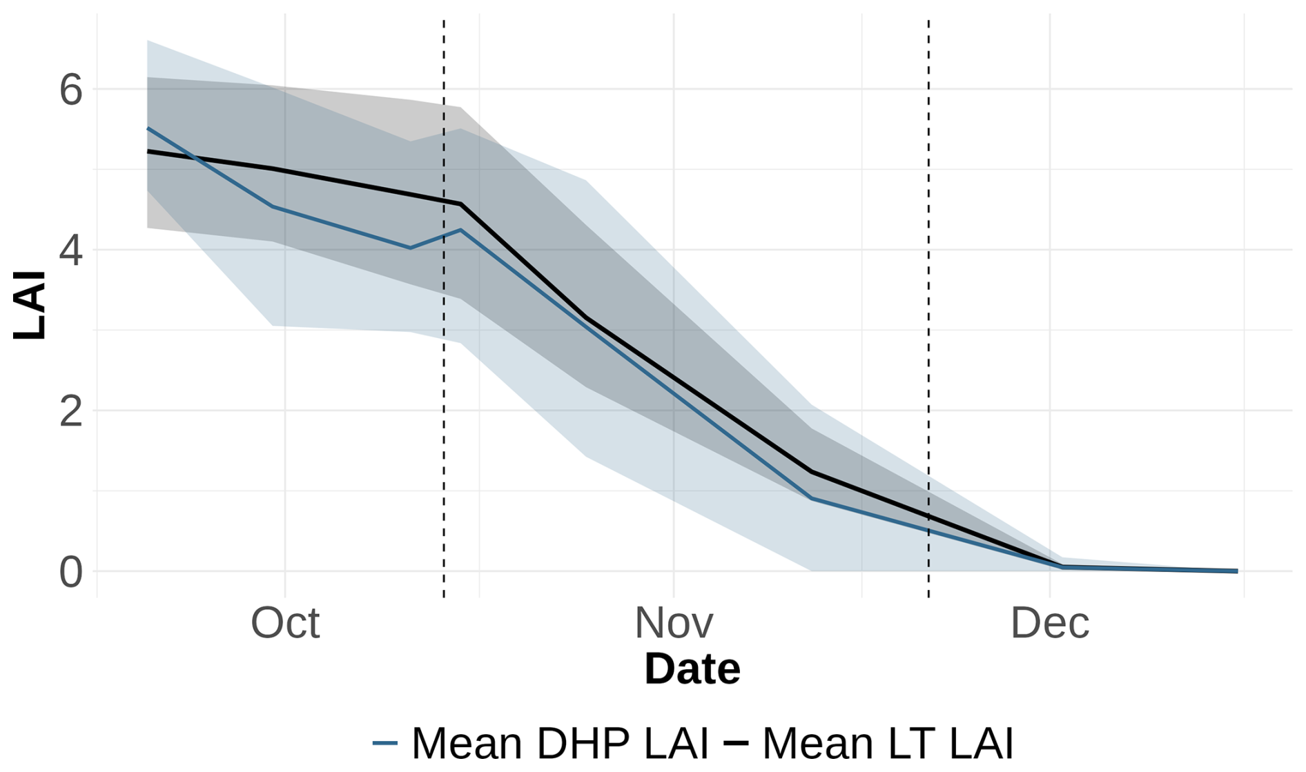 Figure 6Comparison of LT LAI and DHP LAI (estimated with VZA 20° and clumping index LXG1) over time for all sample points, showing the mean values and the 5th to 95th percentile for each time point. The solid black line represents the mean of actual LAI for all sample points, while the blue line shows the mean of DHP LAI for all sample points. The shaded regions indicate the 5th–95th percentile range for both LT LAI and DHP LAI, highlighting the variation and the spread of the data over time. Dashed vertical lines represent breakpoints identified in the segmented regression analysis, marking significant shifts in LAI trends.