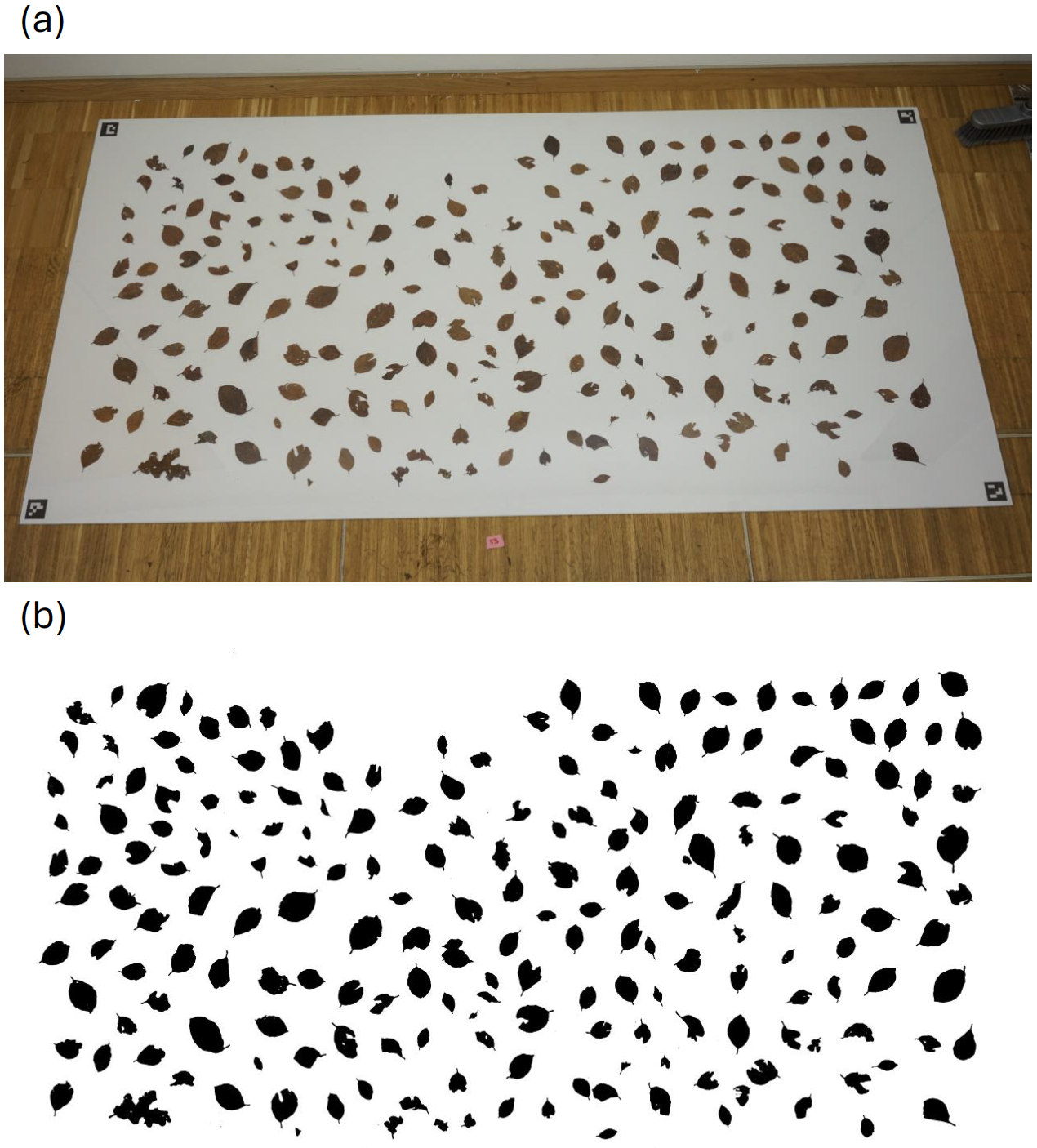 Figure A1Leaf area measurement process from litter traps. (a) shows the original image of the collected leaves, spread out on a 2 m × 1 m background and pressed flat with a Plexiglass sheet to reduce deformations. (b) demonstrates the rectified image with the binary mask of the leaves, generated by applying grayscale thresholding (240) for pixel-wise segmentation. The mask separates the leaf regions from the background.