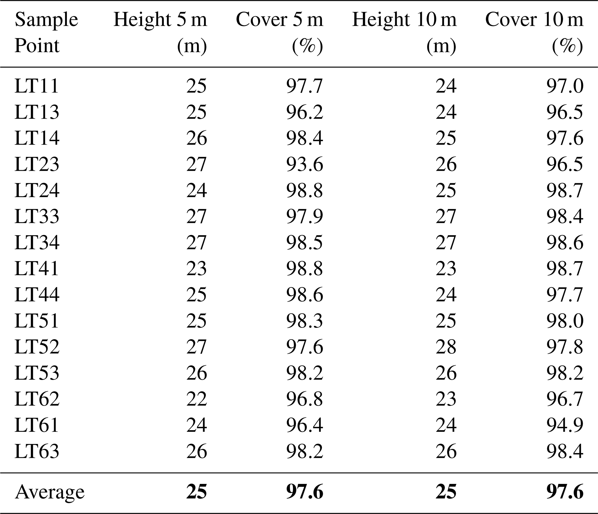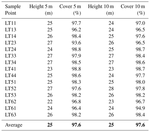 Table A1Sample Point Data for Mean Height and Canopy Cover. These statistics were derived from a drone-based LiDAR point cloud (DJI Matrice equiped with an L2 flown at 60 m height). The statistics were derived from a canopy height model and buffers at 5 and 10 m radius around the sample points. The last row displays the average of all sample points for the corresponding column.