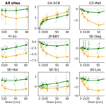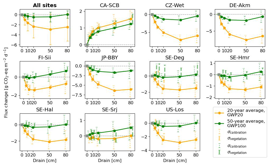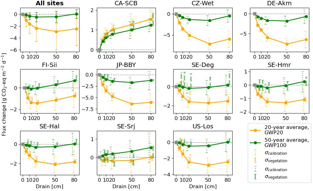 Figure 10Change in fluxes (relative to undrained) expressed as CO2-equivalents by drainage level (x axis), averaged over 20 and 50 years following the start of drainage. CH4 emissions were converted to CO2-equivalents using GWP20 for 20 year average (orange lines) and GWP100 for the 50 year average (green line). In the plot with all sites, the error bars parameter calibration uncertainty (σcalibration), quantified as ±1 standard deviation of the simulated time-mean CO2-equivalent fluxes over the full 50 year simulation period across 10 Monte Carlo runs, and vegetation scenario uncertainty (σvegetation), defined as the minimum–maximum range of simulated responses across alternative vegetation change scenarios (see Appendix D).
