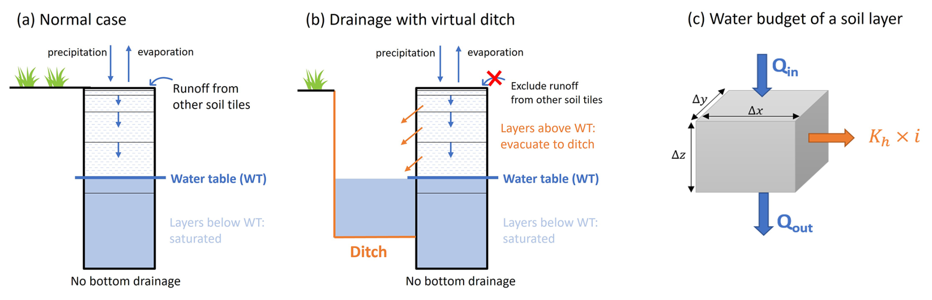 Figure 1Illustration of drainage by ditch simulation in the ORCHIDEE-PEAT model: (a) Soil column without a ditch, showing vertical water fluxes and horizontal delivery from the runoff of adjacent soil tiles without peat. (b) Soil column with a ditch, incorporating lateral water loss to the ditch (orange) and suppression of runoff from other tiles. (c) Water budget of a soil layer, with lateral output fluxes due to drainage into the ditch highlighted in orange. The dimension of the volume of soil is defined by Δx, Δy and Δz. Qin and Qout are inward and outward water fluxes and Kh is the horizontal hydraulic conductivity and i is the hydraulic gradient.