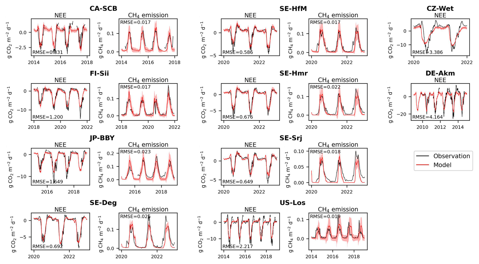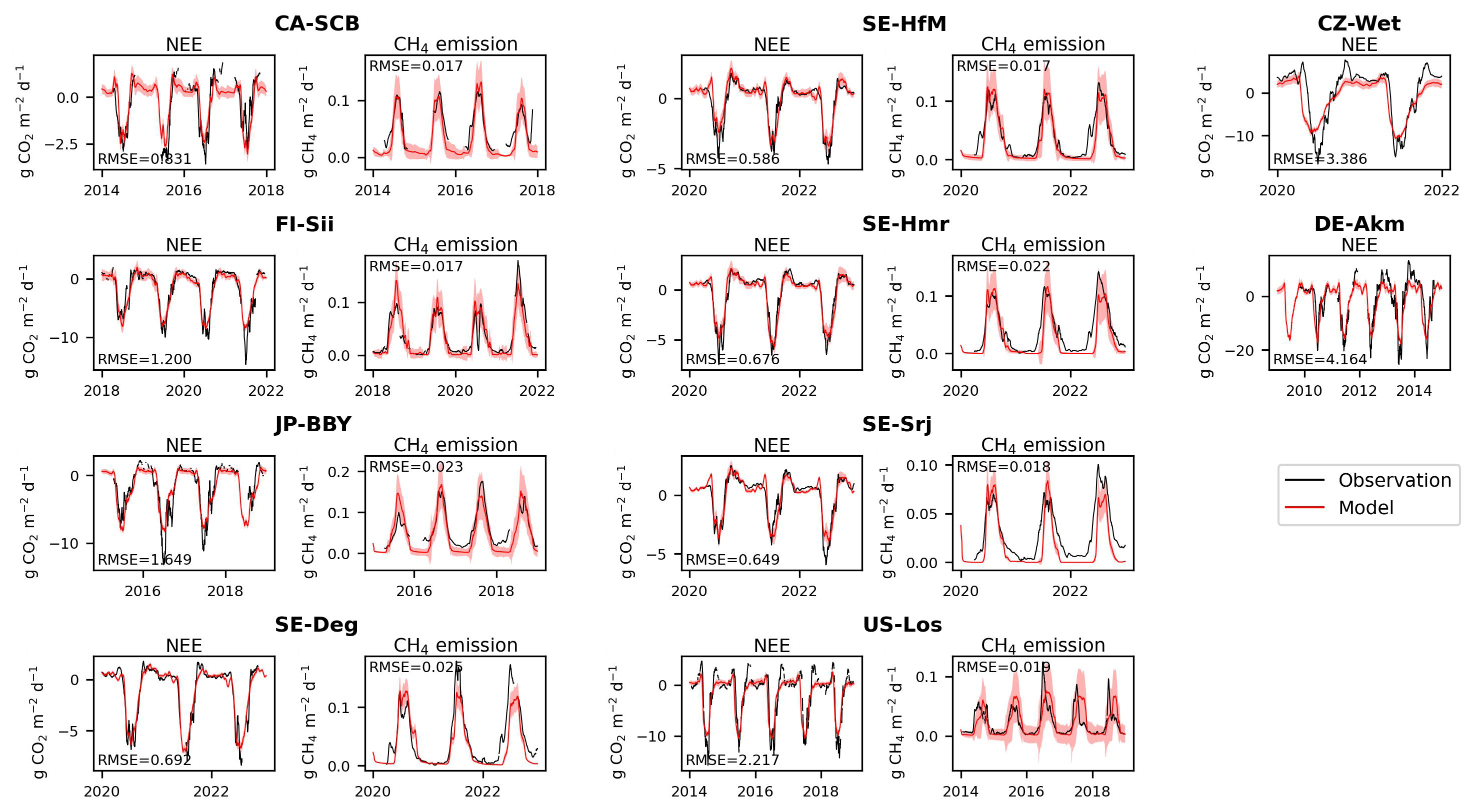 The results of the model calibration under present conditions are shown in Fig. 2, with CO2 fluxes (Net Ecosystem Exchange, NEE) and CH4 emissions calibration for sites that have observations of both fluxes (Fig. 2a–h), and CO2-only calibration for other sites (Fig. 2i and j). The CH4 fluxes of all eight sites were well simulated, with RMSE ranging from 0.017–0.025 . The calibrations of NEE also showed good performance, with RMSE smallest at Sweden sites (from 0.585–0.691 ).