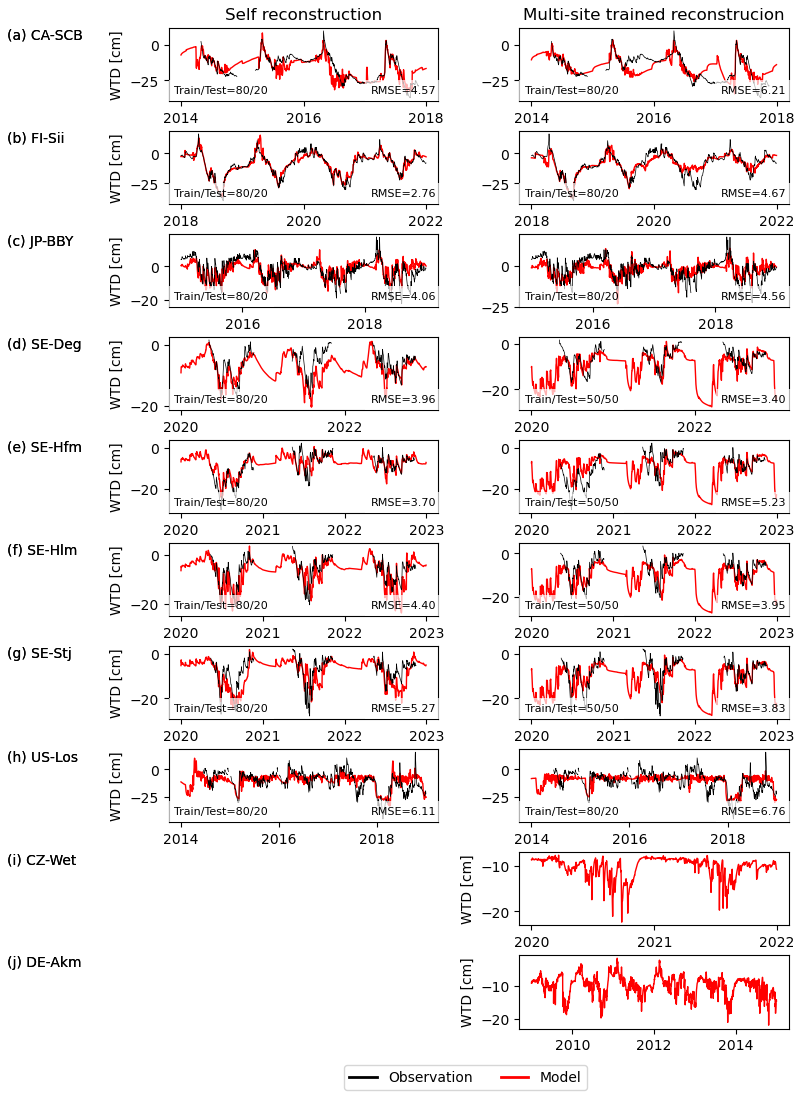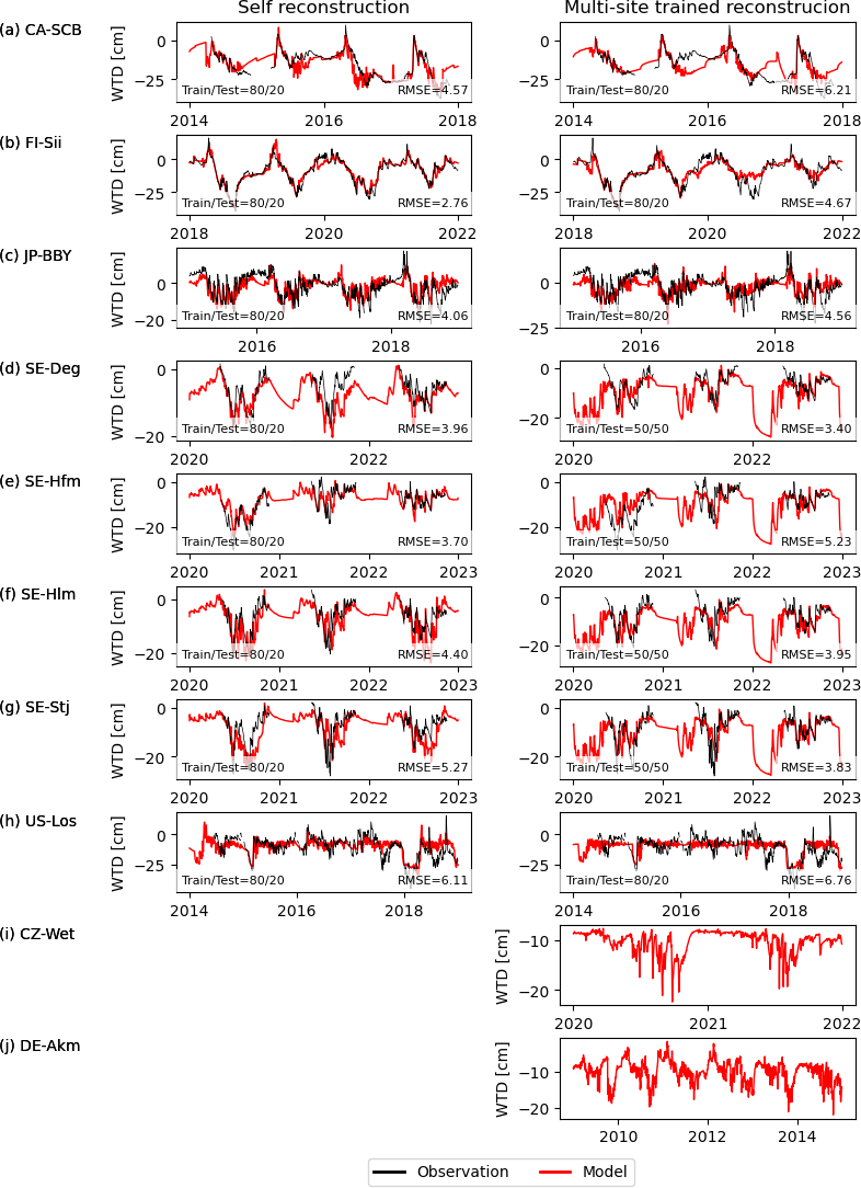 Figure 3 presents the reconstruction of water table depth from soil moisture with the SVR model trained for individual sites (Fig. 3a–h, left column). The RMSE of modelled and observed water table depth ranged from 2.76 cm (FI-Sii) to 6.11 cm (US-Los) and the model captured in general the seasonal variations very well, though less so the short-term variations. At the Swedish sites, the peat is frozen between mid-October to early May, during which time the WTD is not fluctuating in reality. However, due to the lack of WTD measurements during these frozen periods, the self-reconstructed WTD from the SVR model for these times were accepted as the best available approximation. With the SVR model trained using all the sites together, SVR was less effective because it must compromise the patterns between all the sites: RMSE increased up to 6.76 cm but still captures the main seasonal variations. The water table depth reconstructed using SVR trained from all other sites and applied at the two sites where direct WTD observations were missing including CZ-Wet, DE-Akm (Fig. 3i and j, right column) was used in this study as the baseline water table depth.
