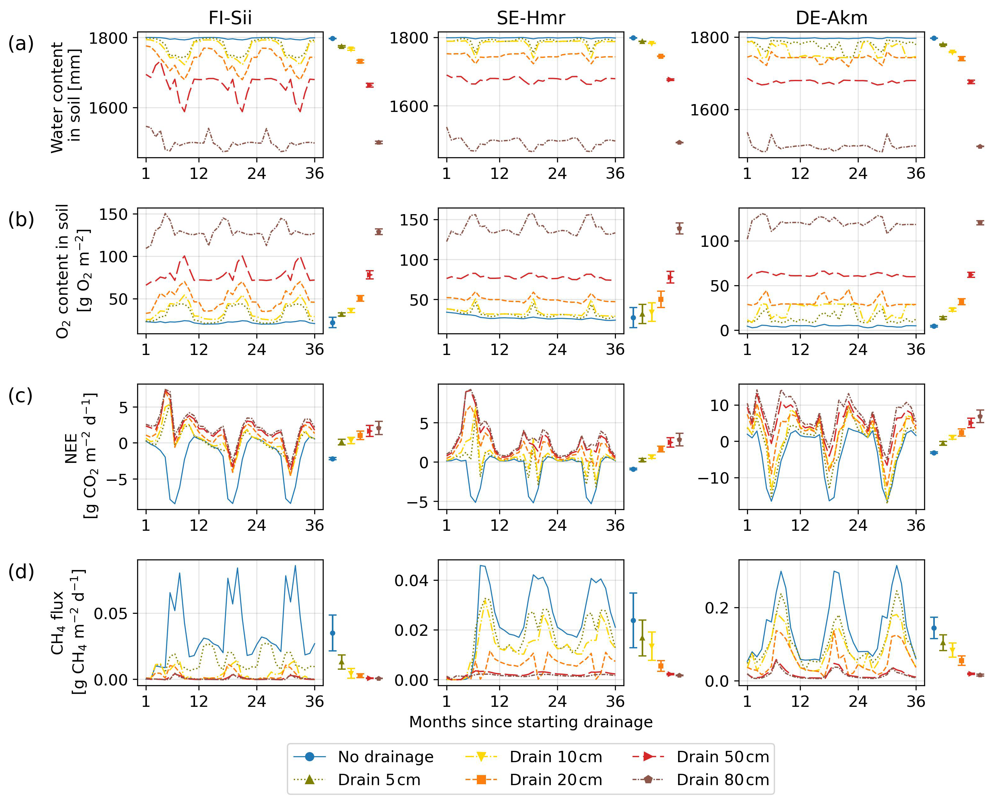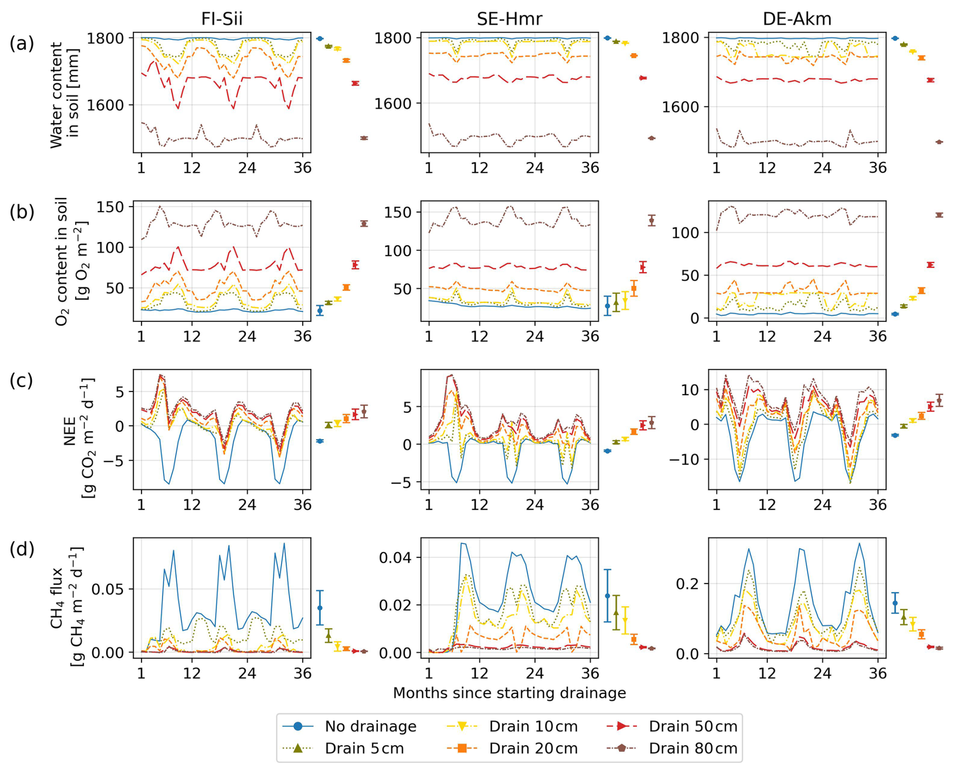 Figure 4Simulated changes at three sites of (a) soil water content in the whole profile (2 m), (b) soil oxygen content, (c) Net Ecosystem Exchange of CO2 and (d) methane emissions. Different colors indicate different water table depths below the original water level at each site. The coloured bars on the right of each panel summarize parameter uncertainty, quantified as ±1 standard deviation of the simulated time-mean fluxes computed over the full 50 year drainage simulation from 10 Monte Carlo runs. The coloured dots indicate the time–mean flux simulated using the calibrated parameter set. Note that when a flux (e.g. CH4) is close to zero, the corresponding parameter-induced uncertainty also approaches zero.