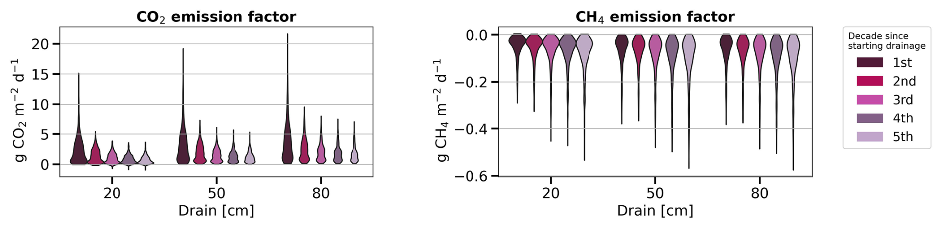 In addition, meta-analyses gathering data from various sites and methods (Couwenberg et al., 2010; Maljanen et al., 2010; Prananto et al., 2020) have been combined with empirical upscaling models of drainage-induced GHG fluxes (Evans et al., 2021; Huang et al., 2021b) across diverse geographic regions, peatland types and conditions. Meta-analyses consistently suggest that post-drainage peat decomposition causes long-term legacy CO2 emissions, persisting decades after drainage (Couwenberg et al., 2010; Huang et al., 2021b; Zou et al., 2022). Concurrently, meta-analyses show that CH4 emissions are reduced and N2O emissions can be increased during drainage (Zou et al., 2022; Tikkasalo et al., 2025), the latter of which applies to N-rich sites.
