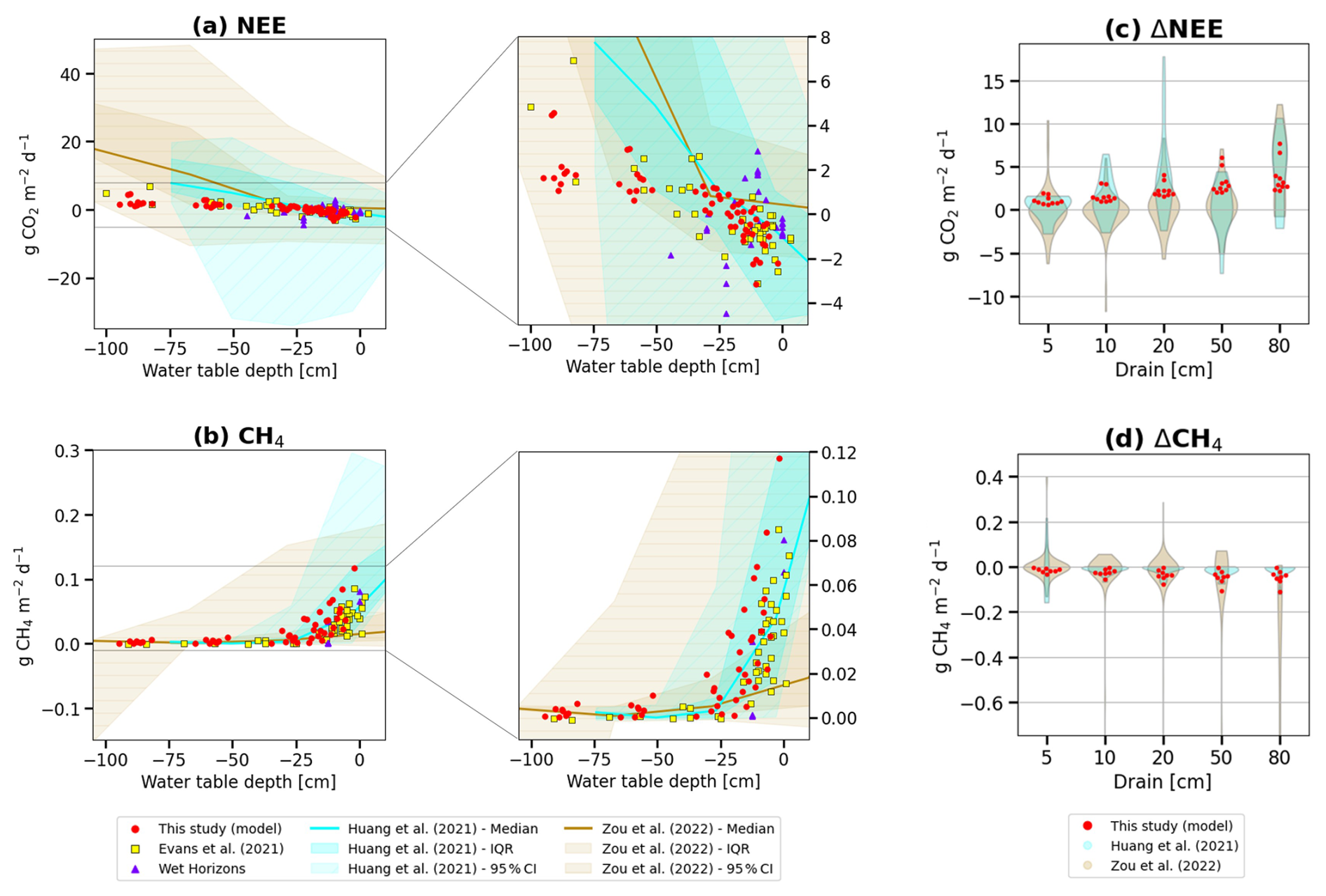Figure 6Simulated fluxes of (a) Net ecosystem exchange of CO2 and (b) CH4 emissions for different water table levels below the original water surface (red points) compared with meta-analysis observations from Huang et al. (2021b) (cyan) and Zou et al. (2022) (brown), and with field measurements from Evans et al. (2021) (yellow) and WET HORIZONS project (purple). The darkest color shading represents ±1 standard deviation across observed sites, and the lightest shading indicates the minimum–maximum range of the observations. (c) Modeled (red dots) and observed distributions of NEE changes (ΔNEE) for different water table depths of drainage, compared with meta-analysis results, and (d) same for CH4 emissions changes (ΔCH4). For consistency with observational datasets, model results were averaged over the first 10 years of simulations, corresponding to the period during which most post-drainage observations were collected.