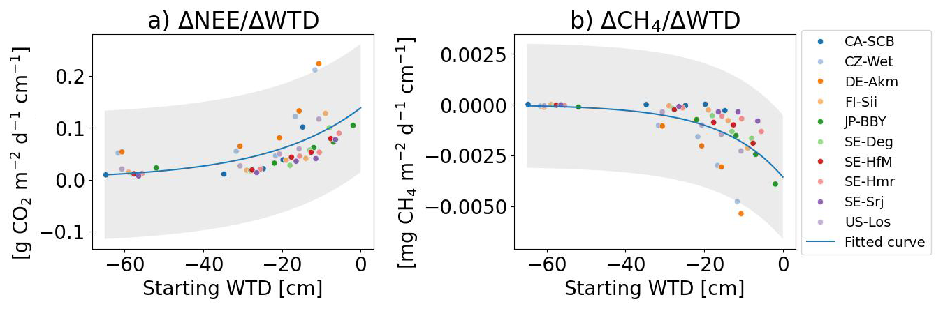 Firstly, we analyzed whether the sensitivities depend on the magnitude of the initial fluxes, based on the hypothesis that a site with a higher baseline flux before drainage would experience more drastic changes during drainage. Among all sites, DE-Akm and CZ-Wet had the highest sensitivities of NEE (0.14 and 0.12 , respectively, Fig. 8a). These two sites, along with JP-BBY, also exhibited the greatest CH4 emissions sensitivities (−3.17, −2.85, and −2.37 , Fig. 8b). These sites were all characterized by the largest initial CO2 sinks and CH4 emissions before drainage. Conversely, the site with the smallest pre-drainage CH4 emissions, CA-SCB, had the smallest CH4 sensitivities. SE-Srj has the smallest NEE sensitivities with the smallest initial NEE. Overall, we found that the CH4 sensitivities show a very strong linear relationship with initial CH4 emissions (R2=1, p<0.001) across sites. Similarly, the NEE sensitivities are correlated with the initial NEE, but the relationship is weaker (R2=0.71, p=0.002) (Fig. 9, top row).