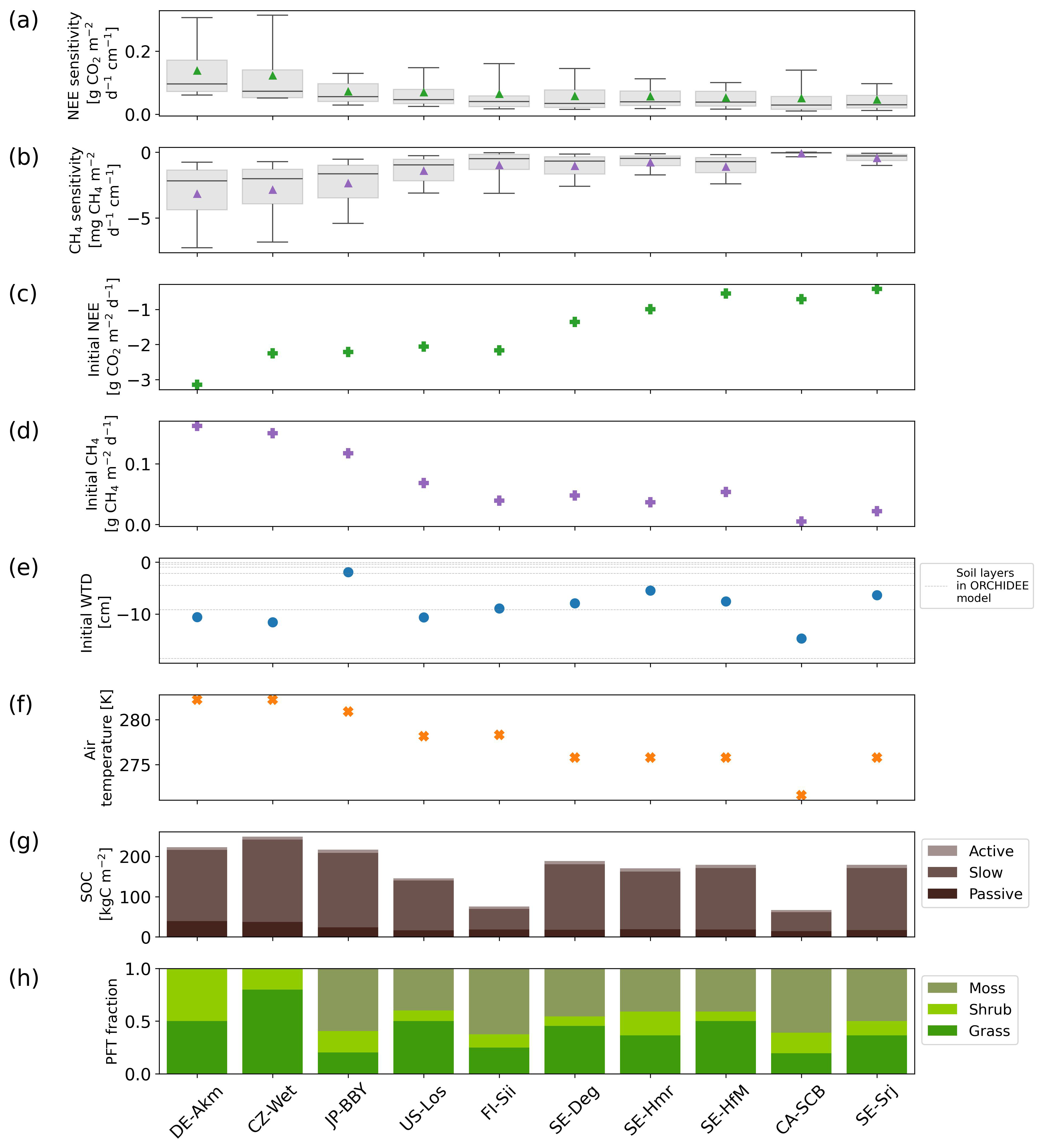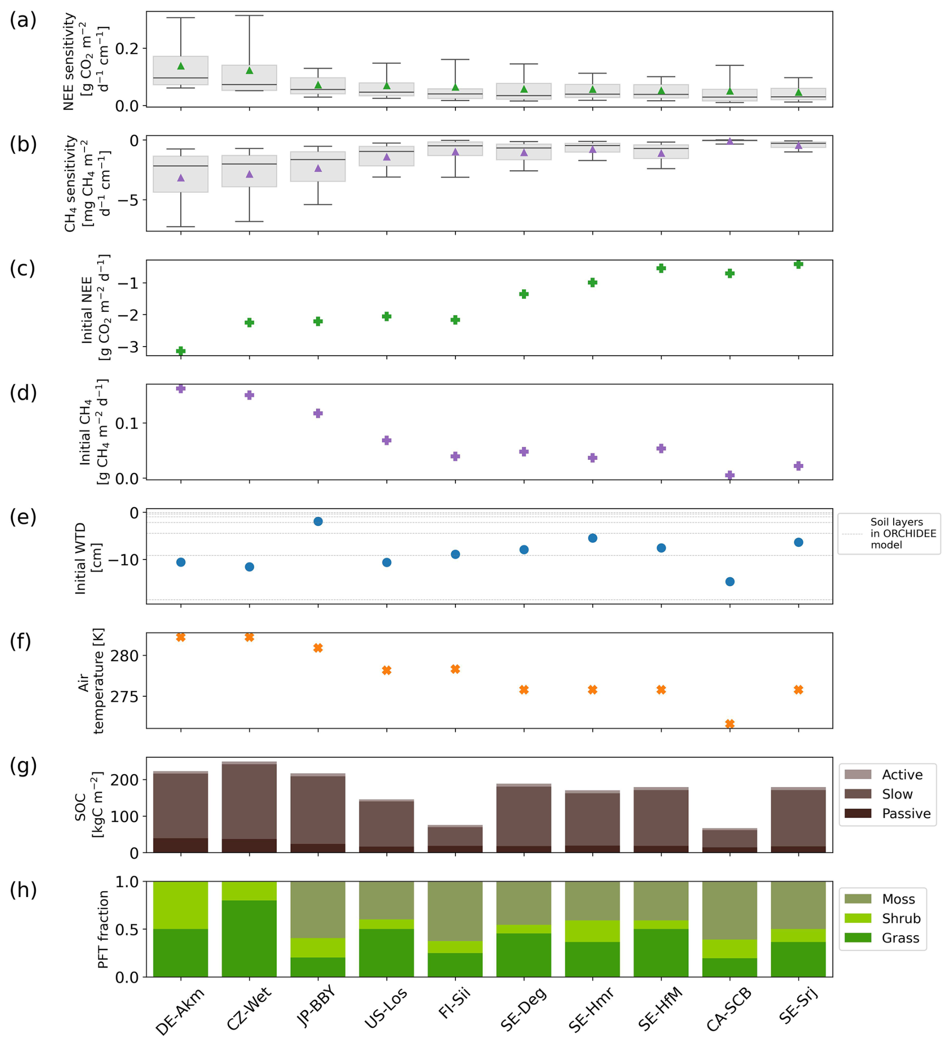 Figure 8Summary of site-level sensitivities and explanatory variables used to analyze the drivers of drainage responses. (a) Sensitivity of NEE to water table drawdown at each site, expressed as the change in flux per centimeter of deeper water table depth (); positive values indicate reduced CO2 uptake or net emissions with deeper WTD, (b) same as (a), but for CH4 emissions (); negative values indicate reduced CH4 emissions with deeper WTD. (c) Initial NEE, (d) initial CH4 emissions prior to drainage Additional modeled variables examined for their role in explaining the sensitivities include (e) initial water table depth prior to drainage (negative values indicate water table below the surface), (f) annual mean air temperature, (g) modeled soil organic carbon density (SOC), calculated as the sum of active, slow, and passive pools over the full soil column, and (h) peatland vegetation composition including peatland graminoids, shrubs, mosses. All statistics are based on modeled results from the first 10 years of drainage simulations, consistent with the temporal window used for sensitivity analysis.