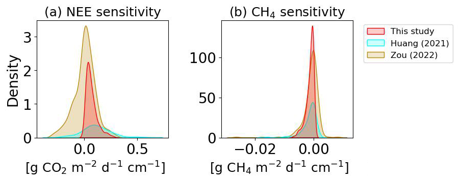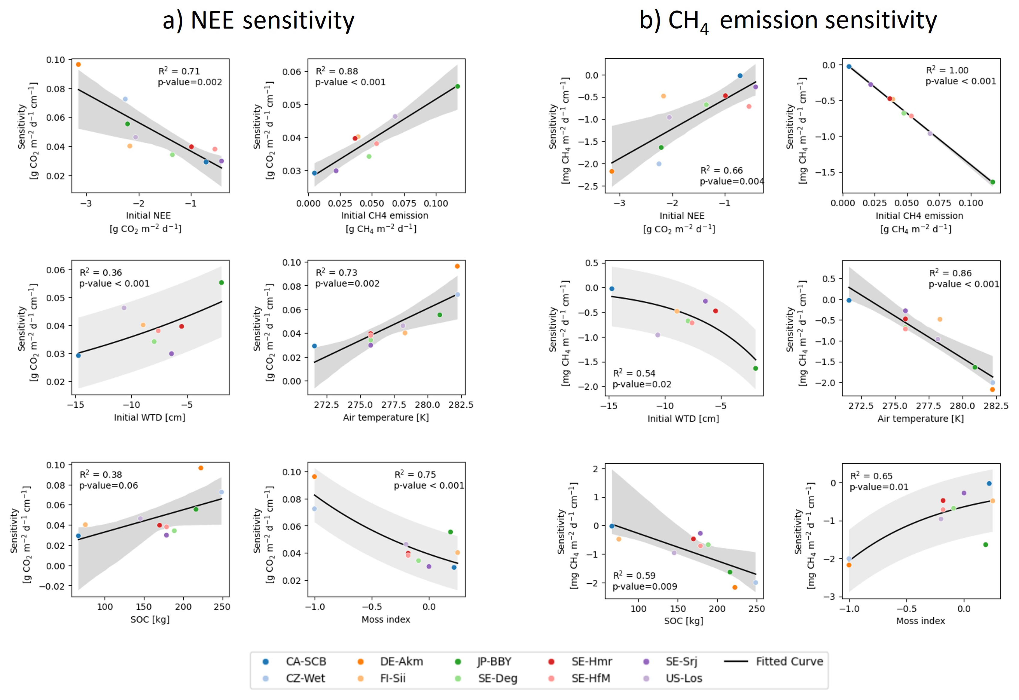 Finally, air temperature was also found to have a correlation with sensitivities. Sites in warmer climates tend to have more sensitive NEE (R2=0.73, p=0.002) and CH4 emission (R2=0.86, p<0.001) responses (Fig. 9a and b, middle right items). However, it remains uncertain whether these correlations are causal or reflect co-variations between temperature and other factors, given the small number of points in the regressions shown in Fig. 9.