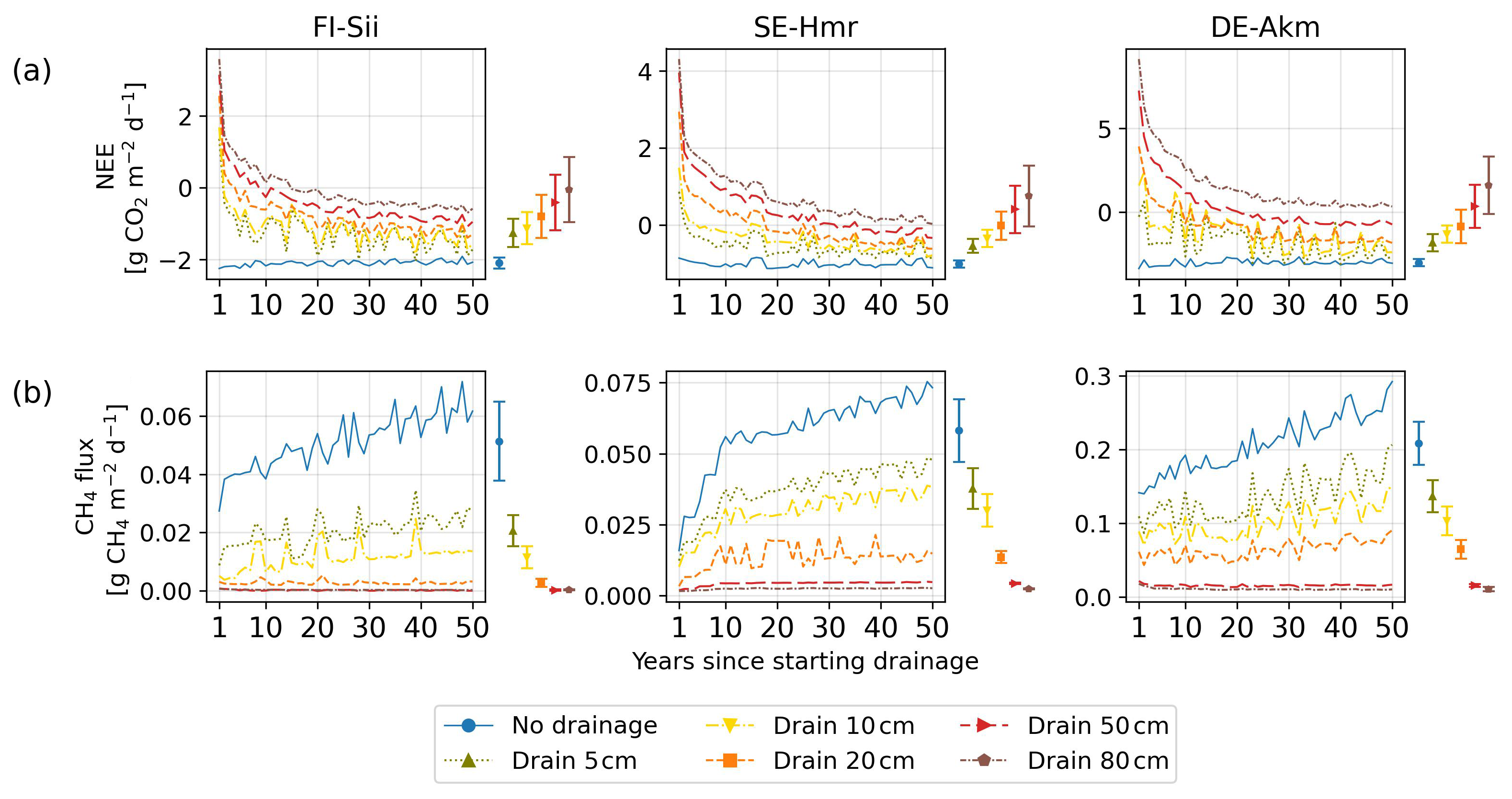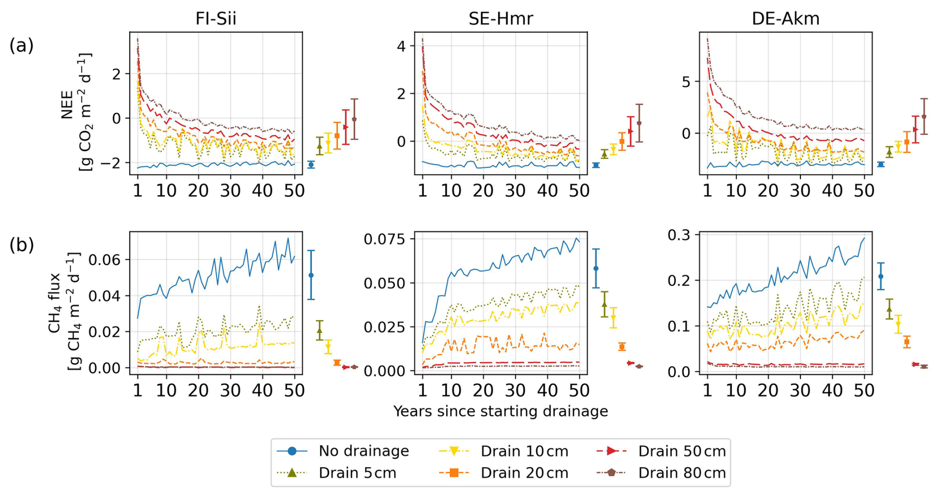 Pre-drainage simulations were run for each site over a period of 100 years. We then simulate five virtual idealized drainage scenarios for each site over a subsequent 50 year future period in which the water table remains at its initial level to define a baseline and varies each day from hydrological balance simulations (no drainage), or is prescribed at 5, 10, 20, and 50 cm below the initial/baseline water level. For the 150 years of simulations, 6-hourly climate forcings of the flux-observed years are used by randomly selecting years. The same years are used for the undisturbed and drained simulations to ensure that the resulting differences in fluxes are not caused by differences in climate.