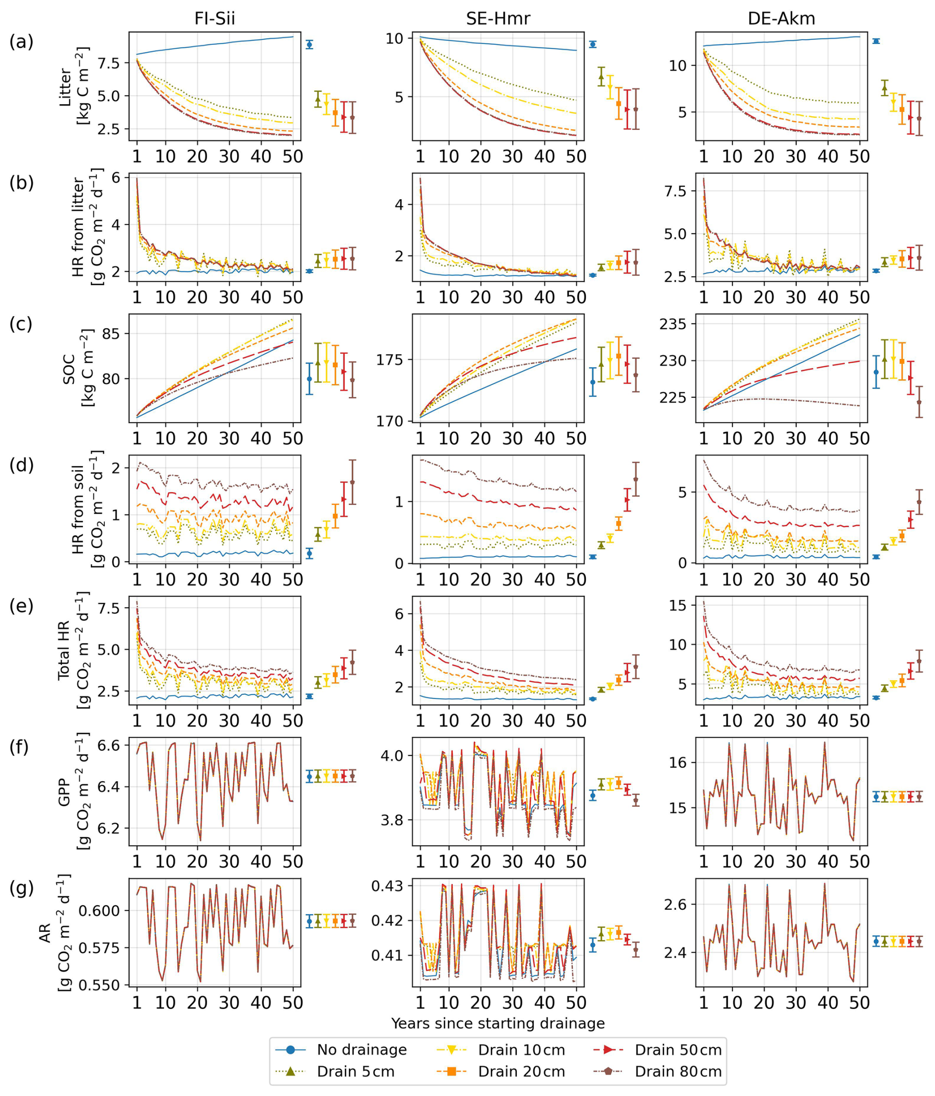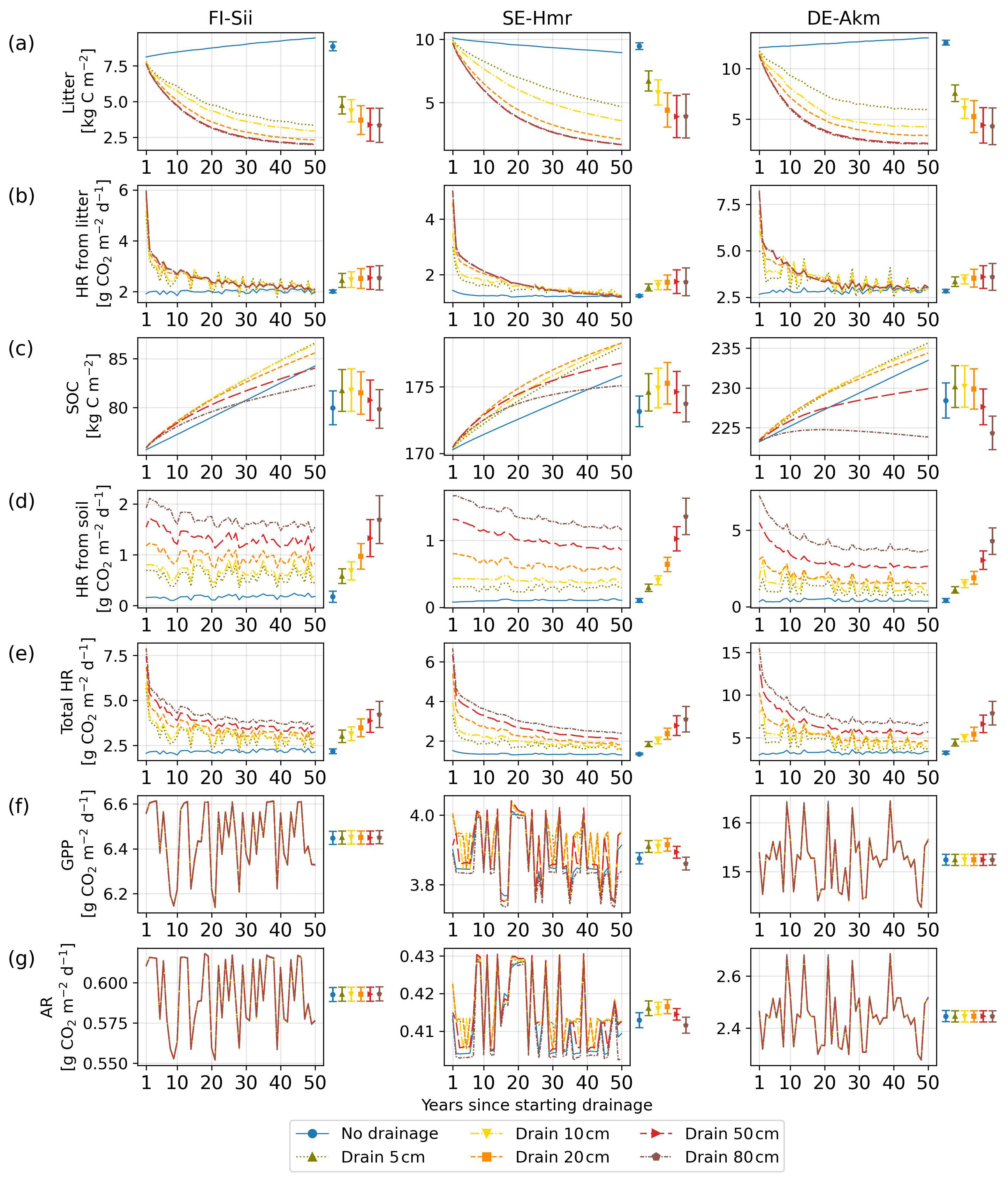 Figure C2Simulated changes in litter carbon and soil organic carbon (SOC) pools and associated heterotrophic respiration over the 50 year simulation period following the onset of drainage. Shown are (a) litter carbon, (b) heterotrophic respiration (HR) from litter, (c) soil organic carbon, (d) heterotrophic respiration from soil, (e) total heterotrophic respiration (sum of litter and soil components), (f) gross primary production (GPP), and (g) autotrophic respiration (AR) at three sites. Different colors and line styles indicate different water table depths below the original water level at each site. The coloured bars on the right of each panel summarize parameter uncertainty, quantified as ±1 standard deviation of the simulated time-mean fluxes computed over the full 50 year simulation from 10 Monte Carlo runs. The colored dots indicate the corresponding time-mean flux simulated using the calibrated parameter set. Note that when a flux (e.g. HR) is close to zero, the corresponding parameter-induced uncertainty also approaches zero.
