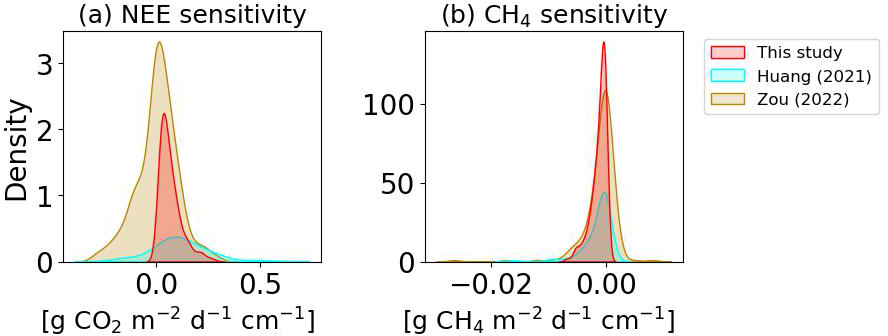 Figure C3Distribution of sensitivities of (a) net ecosystem exchange (NEE) and (b) CH4 emissions to water table drawdown across peatland sites. Results from this study are compared with reference datasets from Huang et al. (2021) and Zou et al. (2022). Sensitivities are expressed as changes in flux per centimeter of water table drawdown (). Modeled results are based on drainage simulations over the first 10 years, consistent with the temporal window used for sensitivity analysis in Figs. 7–9.