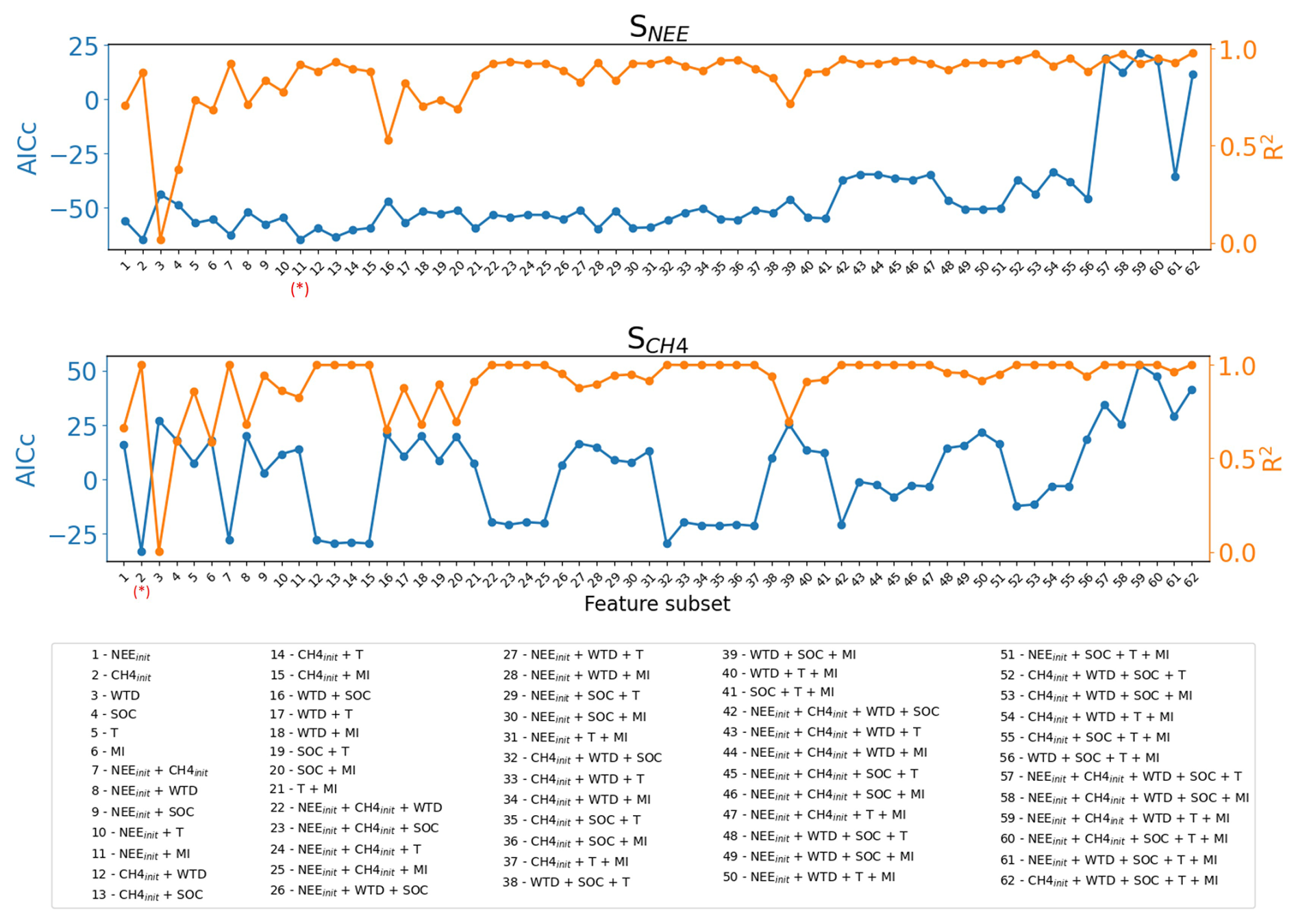 Figure C4Selection of explanatory variable subsets for the sensitivities of net ecosystem exchange (SNEE) and CH4 emissions (). For each possible subset of predictor variables, the corrected Akaike Information Criterion (AICc; blue lines, left axis) and the coefficient of determination (R2; orange lines, right axis) are shown. Lower AICc values indicate better model parsimony. The red star marks the variable subset selected for the exploratory emulator presented in Eqs. (3) and (4).