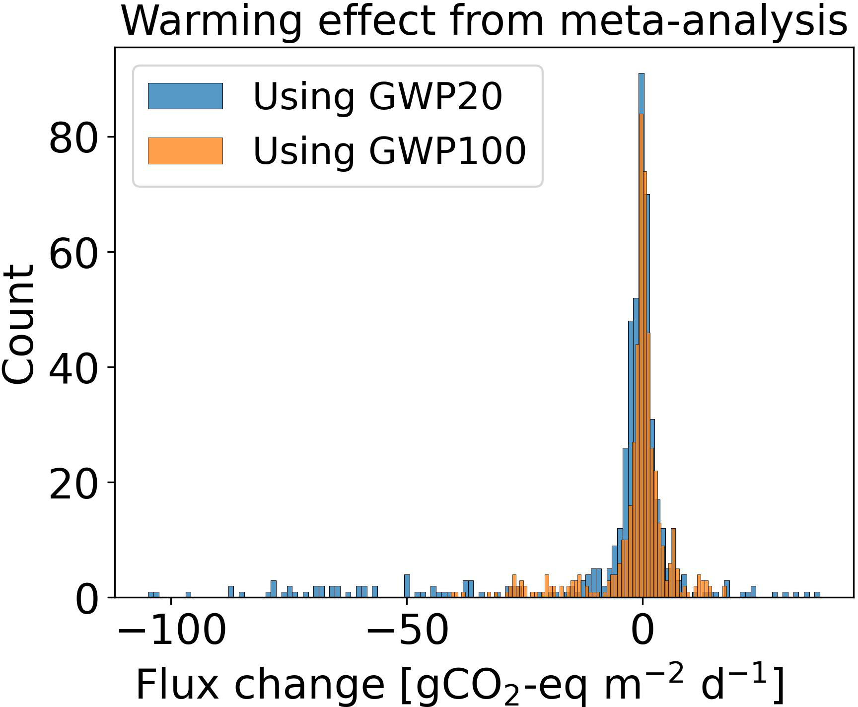 What is the net climate effect of CO2 and CH4 flux changes induced by drainage using the GWP metrics to compare CH4 with CO2. Here we found that, averaged over all WTD depths, drainage during 20 years with radiative forcing calculated with GWP20 is projected by our model to induce a net cooling because the reduction of CH4 emissions dominates over changes of CO2 fluxes. Drainage during 50 years with GWP100 induces almost a net neutral effect. There is a large variability between sites even for the sign of the climate effect of drainage. This gives a more nuanced perspective than the current paradigm that drainage always warms the climate. Importantly, uncertainty in future vegetation, as illustrated by the sensitivity analysis in Appendix D, is not a minor sensitivity: different plausible vegetation scenarios can qualitatively change the assessed climate impact of drainage, including reversing the sign of the net climate effect, and therefore directly affect the interpretation of these results. However, our prediction of a net cooling using GWP20 differs from most previous meta-analysis results and should be interpreted with caution, because it relies on model-based projections extending well beyond the 20 year time horizon associated with the use of GWP20. This result seems at first glance opposite to meta-analysis results, even though our model simulations for flux changes were found to be consistent with these data. The data do not have very long drainage experiments, which may explain the differences with our predictions. However, when taking only sites from meta-analysis studies where both CO2 and CH4 fluxes changes were measured, a net cooling is found, consistent with our model-based projections.
