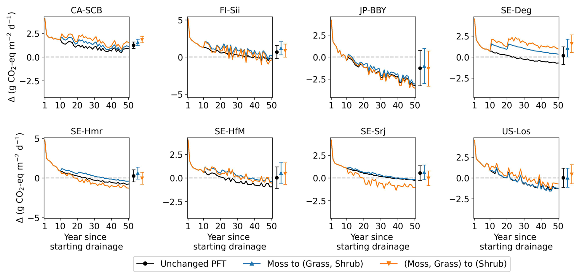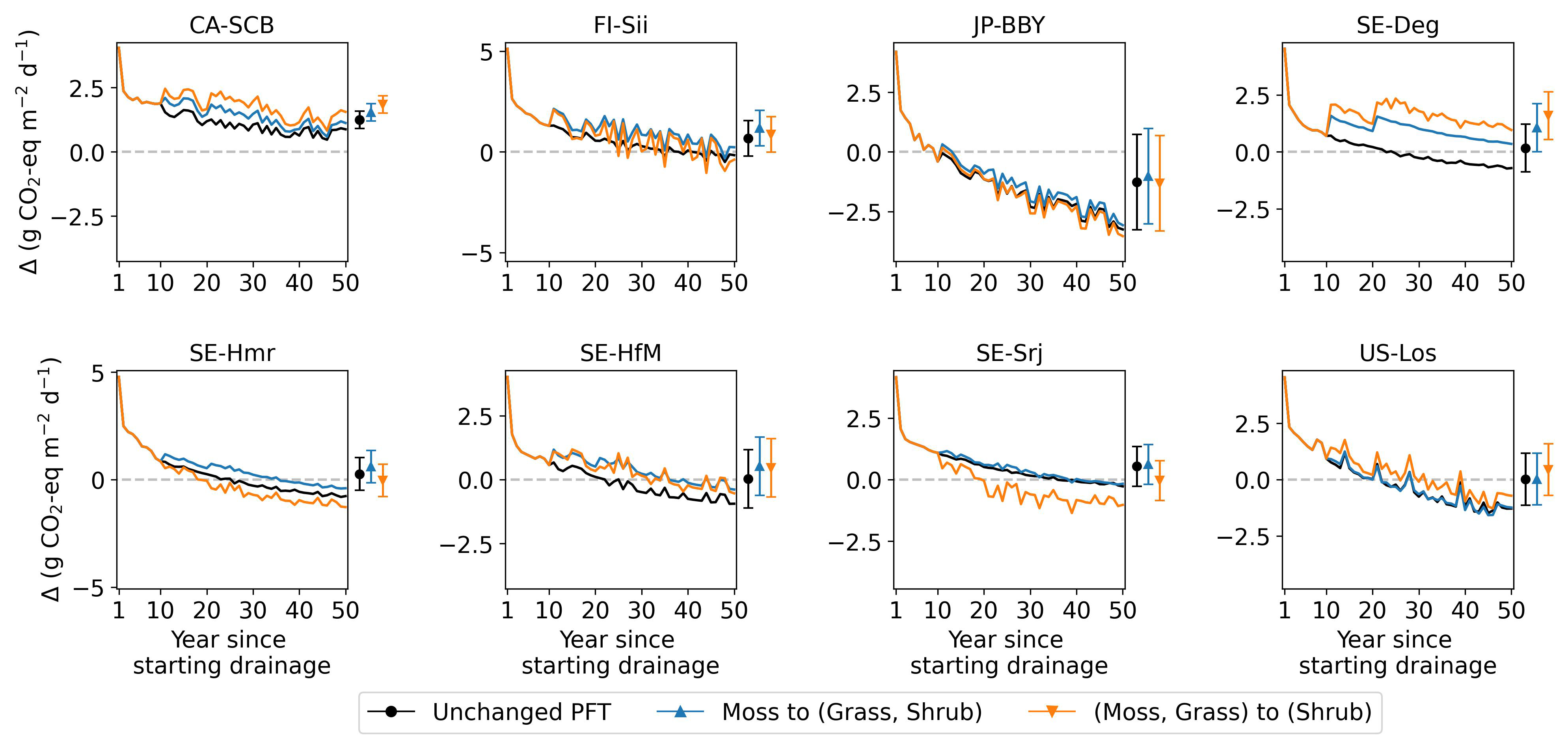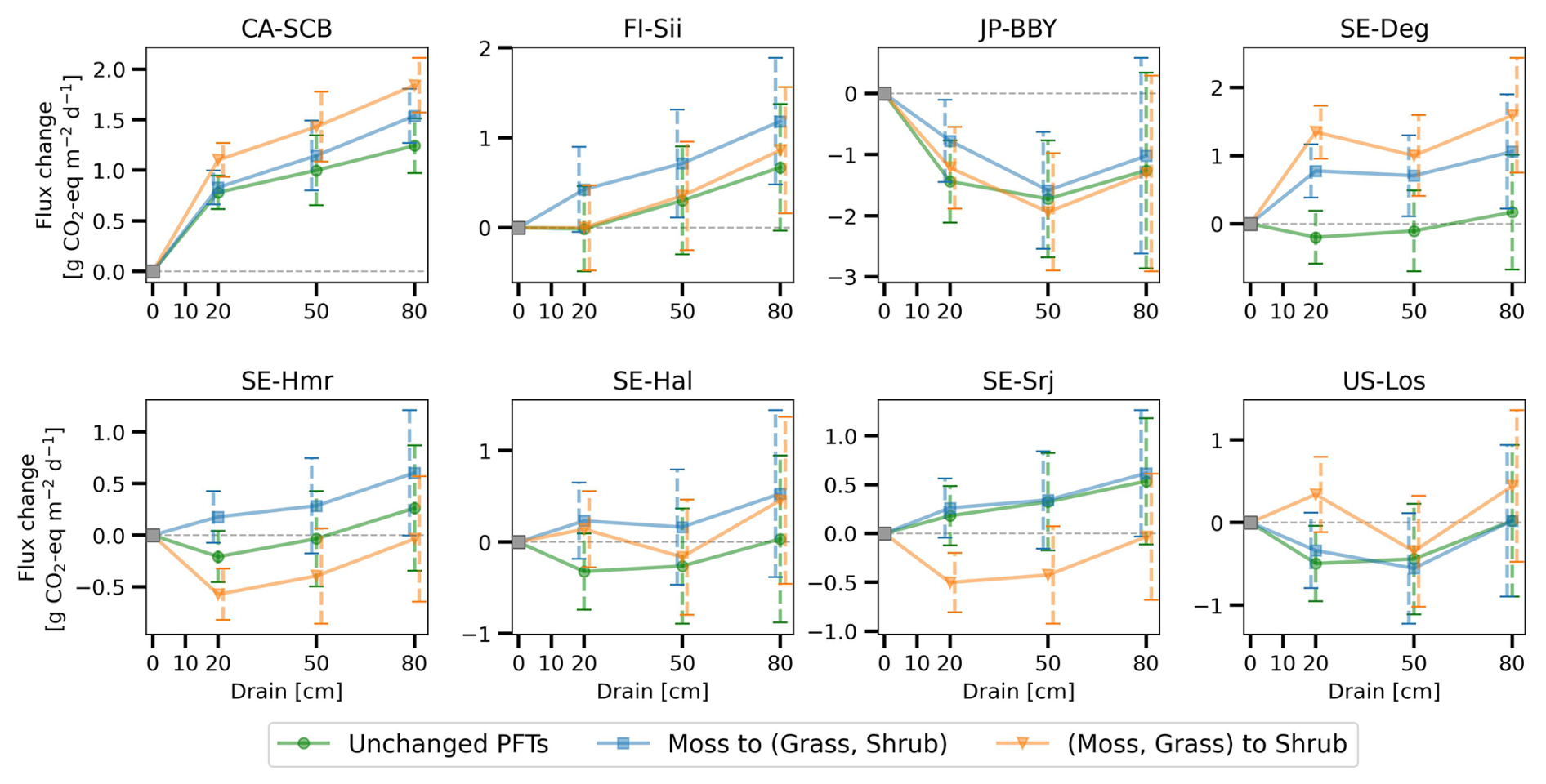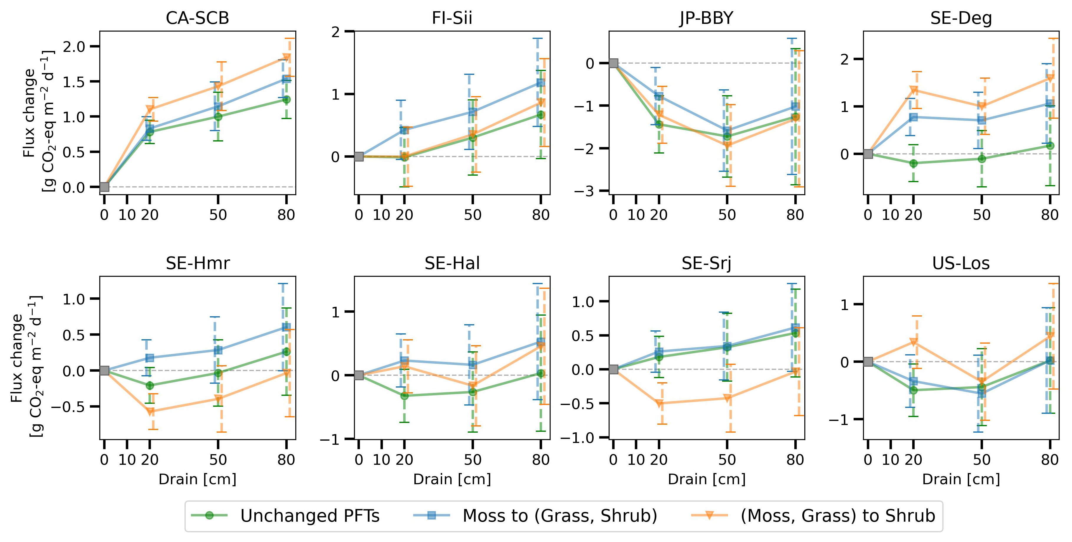 The combined effects over 50 years using GWP100 (similar to Fig. 10) are shown in Fig. D1. At site CA-SCB, FI-Sii, and JP-BBY, both vegetation shifts had slight impacts – drainage still resulted in warming effect at CA-SCB and FI-Sii, and cooling effects at JP-BBY. The conversion of moss to other peatland PFTs had little impact at SE-Srj and US-Los, but led to significantly increased drainage-induced CO2-equivalent emission in SE-Deg, SE-Hmr, and SE-HfM (moving up from green to blue lines). The conversion of moss and grass to shrub caused more variations at these five sites (orange lines): drainage can cause a cooling effect instead of warming (e.g. at SE-Hmr, SE-Srj) or vice versa (e.g. at SE-Deg, SE-HfM). These results highlight the importance of accounting for vegetation dynamics in future modelling. Changes in CO2 and CH4 fluxes under the vegetation change scenarios (relative to the unchanged PFT scenario) are illustrated in Figs. D2 and D3 for the 80 cm drainage case, with the CO2-equivalent emission of the three vegetation scenarios shown in Fig. D4.
