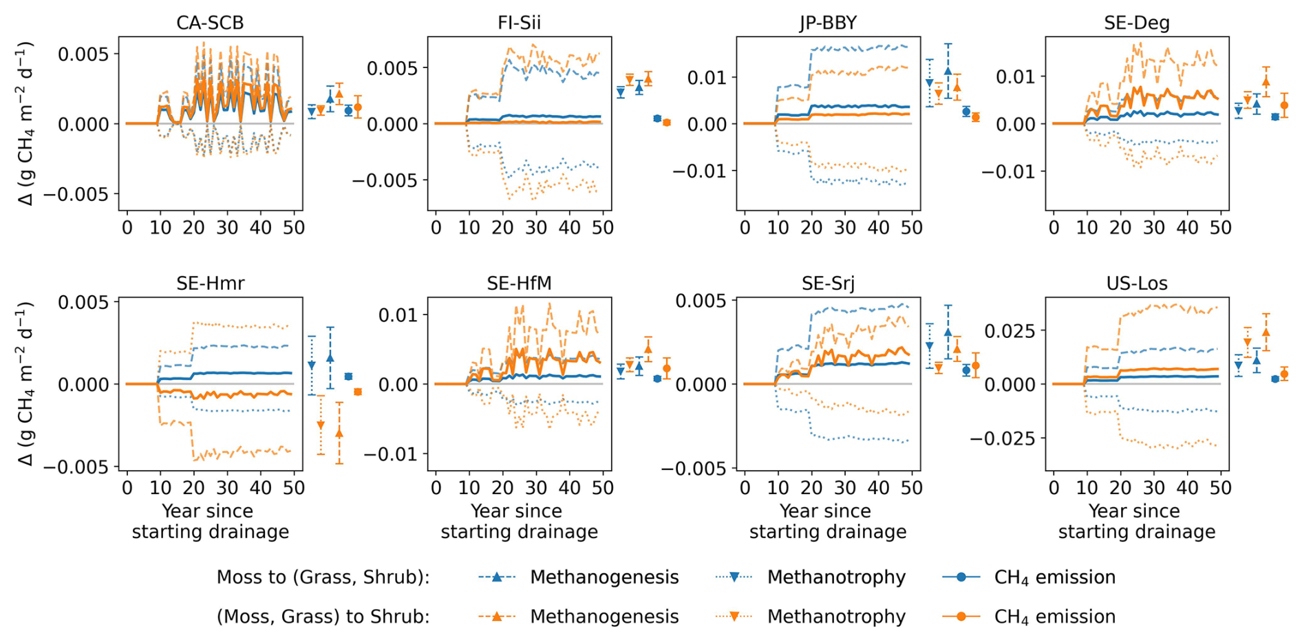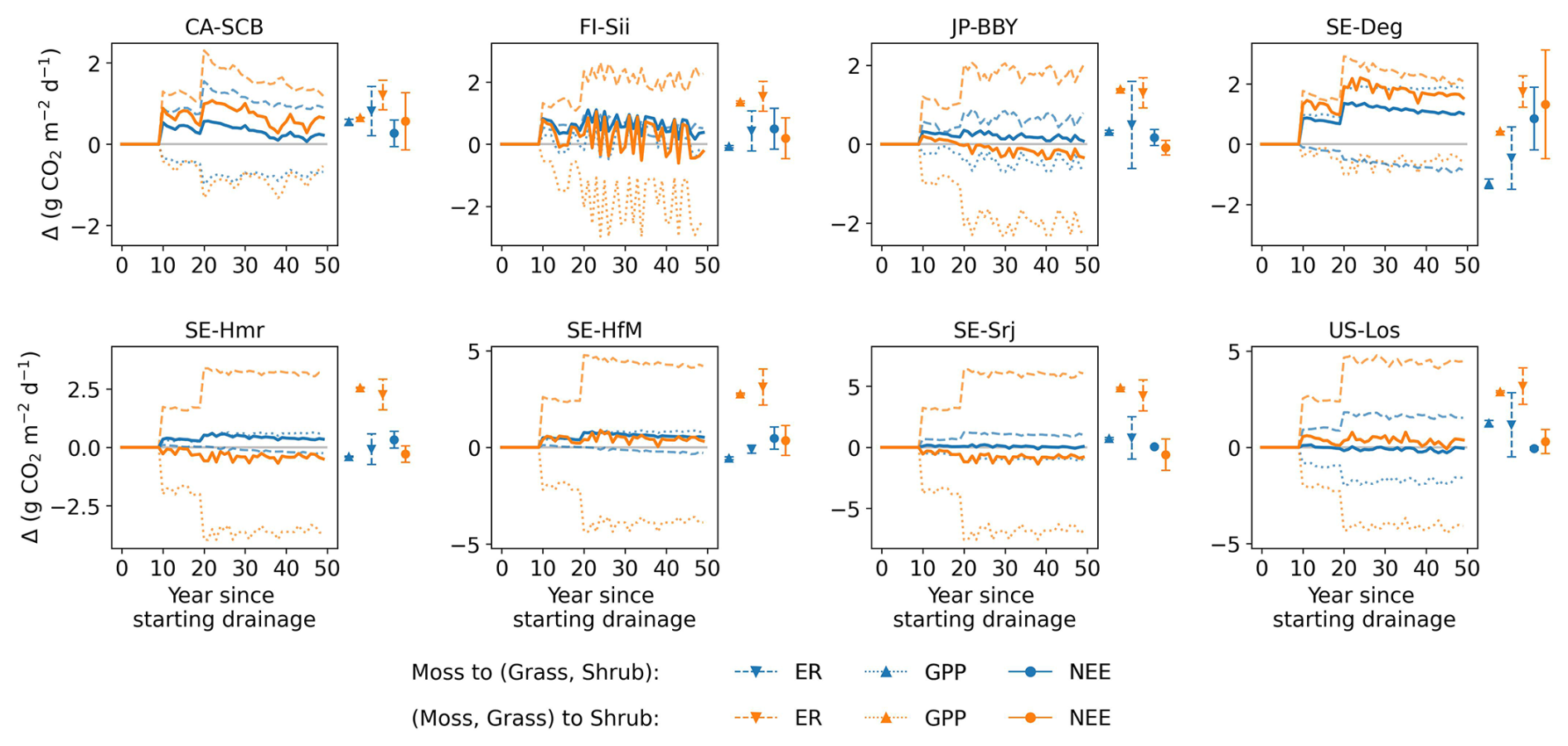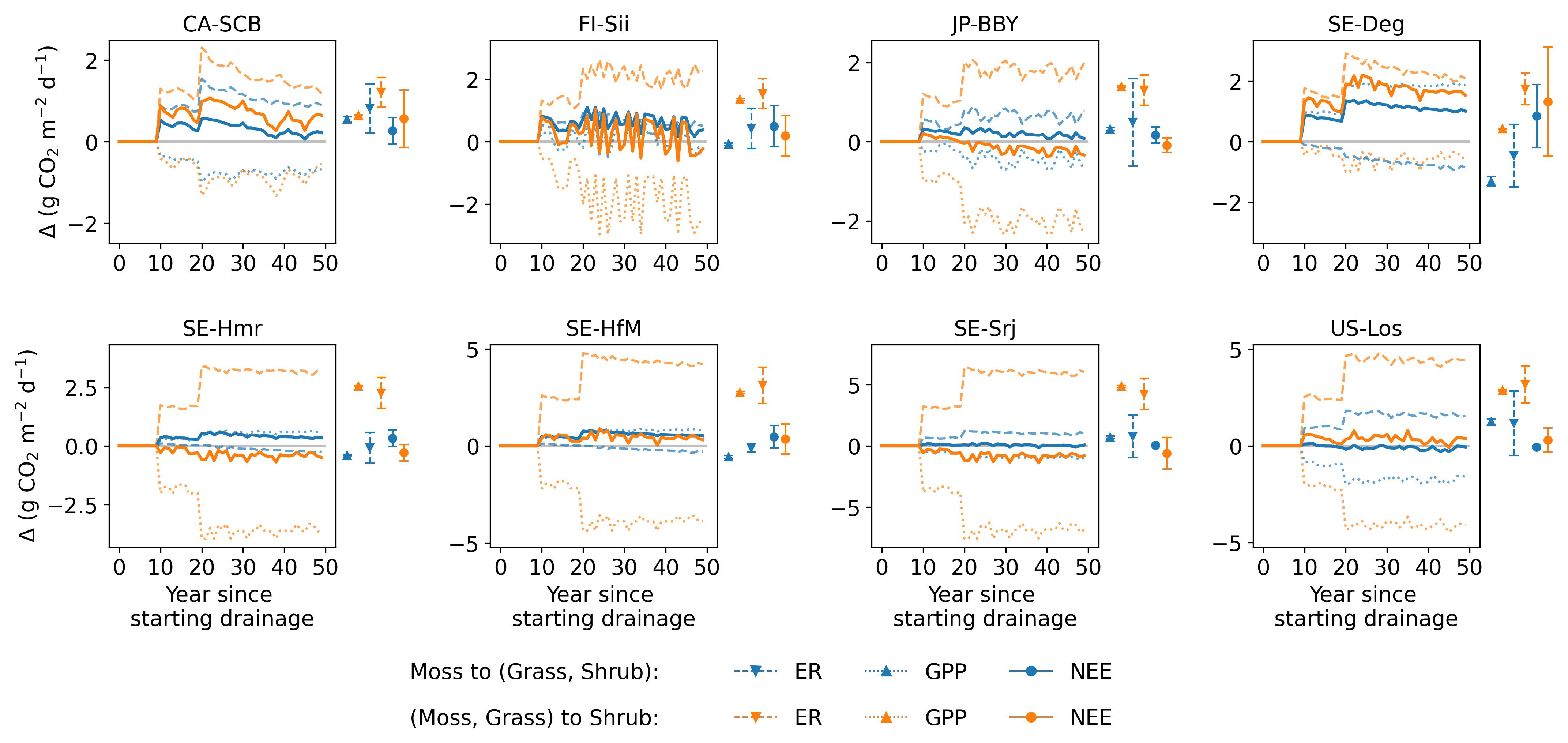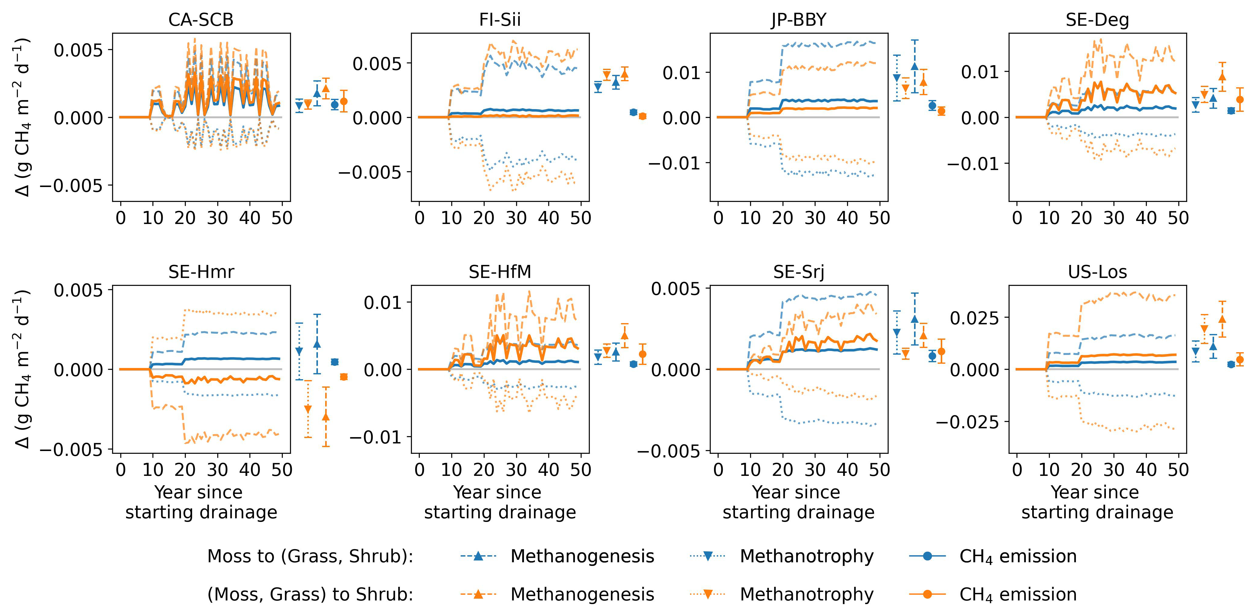 The combined effects over 50 years using GWP100 (similar to Fig. 10) are shown in Fig. D1. At site CA-SCB, FI-Sii, and JP-BBY, both vegetation shifts had slight impacts – drainage still resulted in warming effect at CA-SCB and FI-Sii, and cooling effects at JP-BBY. The conversion of moss to other peatland PFTs had little impact at SE-Srj and US-Los, but led to significantly increased drainage-induced CO2-equivalent emission in SE-Deg, SE-Hmr, and SE-HfM (moving up from green to blue lines). The conversion of moss and grass to shrub caused more variations at these five sites (orange lines): drainage can cause a cooling effect instead of warming (e.g. at SE-Hmr, SE-Srj) or vice versa (e.g. at SE-Deg, SE-HfM). These results highlight the importance of accounting for vegetation dynamics in future modelling. Changes in CO2 and CH4 fluxes under the vegetation change scenarios (relative to the unchanged PFT scenario) are illustrated in Figs. D2 and D3 for the 80 cm drainage case, with the CO2-equivalent emission of the three vegetation scenarios shown in Fig. D4.