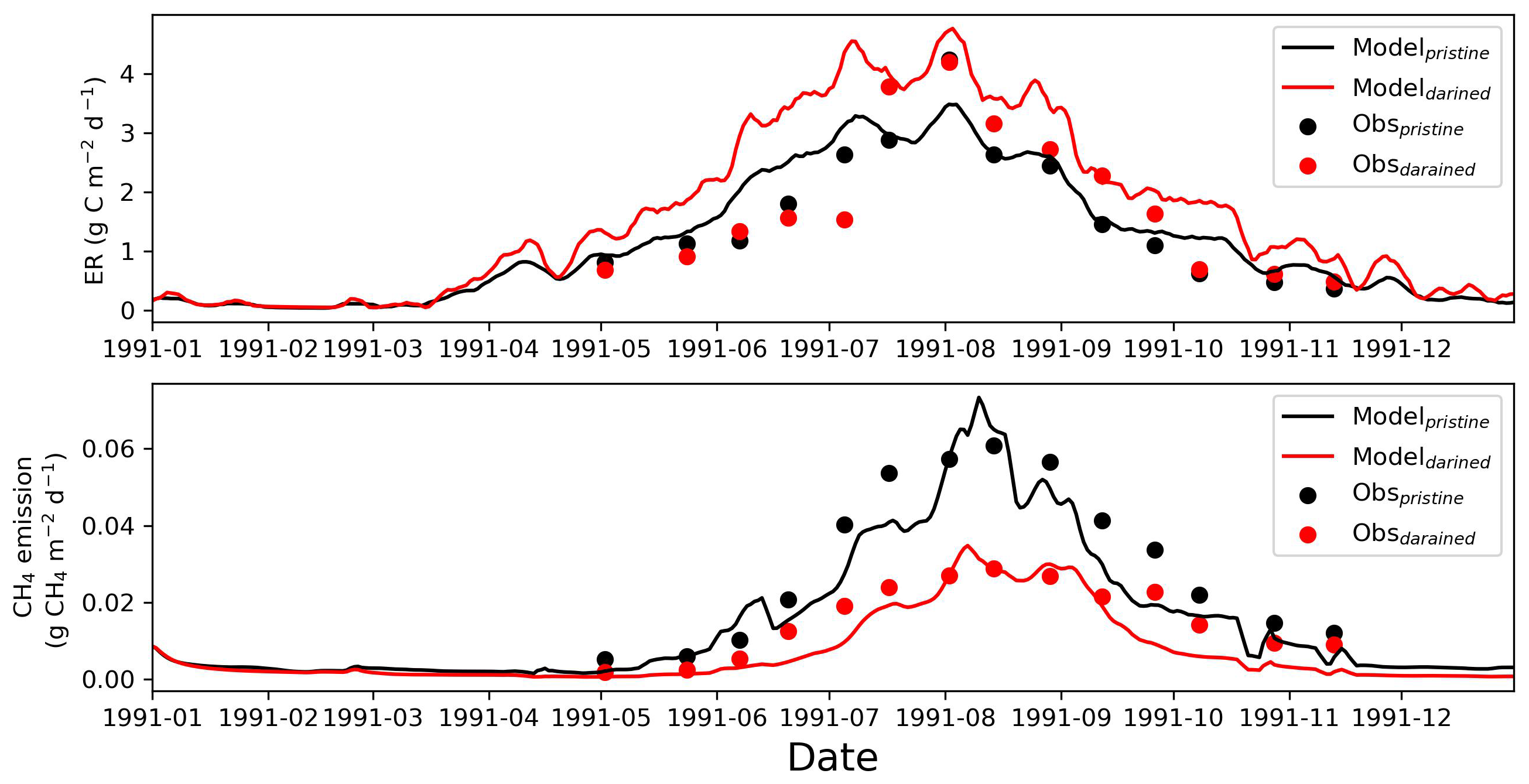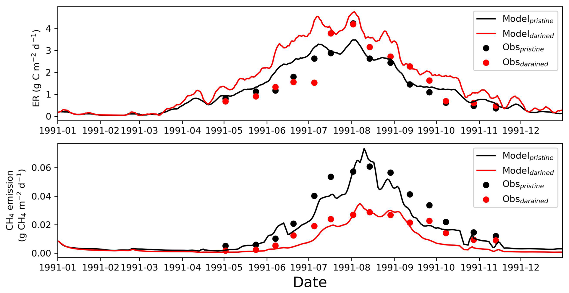 To demonstrate the reliability of the drainage model, we evaluated its performance against available field observations. Although paired drainage experiments with comprehensive and long-term flux measurements are rare, we compiled warm-season (1991) field observations of both ecosystem respiration (ER) and CH4 emissions from a site located near FI-Sii and conducted a dedicated simulation experiment. This site has experienced peatland drainage for approximately 40 years prior to the observation period (Nykänen et al., 1998; Kwon et al., 2022). During the 1991 measurement period, the drained treatment exhibited a water table depth (WTD) approximately 10 cm lower than that of the pristine (control) condition.