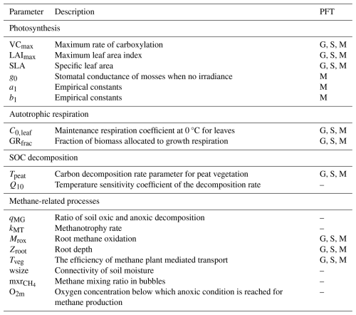 The ORCHIDEE-PEAT model was first run for 100 years to reach the equilibrium state of soil thermal and hydrological conditions, followed by 10 000 years of spin-up to accumulate soil carbon with a fast module that computes only soil carbon changes from daily litter input and soil climate archived from the first simulation (Qiu et al., 2018), using repeated forcing data and a pre-industrial atmospheric CO2 concentration of 285 ppm. An additional 100 year simulation was then conducted before flux observations (Table A1) to simulate biogeochemical processes under observed atmospheric CO2 concentrations. The model was then calibrated for each site under present-day conditions following Liu et al. (2025), here calibrating the parameters controlling CH4 fluxes in addition to CO2 fluxes for sites that have CH4 flux observation. For CO2 fluxes, parameters governing photosynthesis rates, stomatal conductance, autotrophic respiration, soil organic carbon oxic decomposition rate and its sensitivity to temperature (Table B1 in Appendix B) were calibrated. For CH4, we calibrated parameters driving the methane production, oxidation, and transport (Table B1). The calibration was performed using the ORCHIDEE data assimilation system (ORCHIDAS, Peylin et al., 2016), a Bayesian statistical framework, employing a genetic algorithm to minimize a cost function between observation and simulated outcomes (Tarantola, 2005), i.e. here between observed and simulated daily NEE, and daily CH4 emission simultaneously. For sites without CH4 flux observations, only CO2 parameters can be calibrated, while parameters related to CH4 processes were assigned using the average calibrated values from all sites with available CH4 flux observations. After the calibration, to quantify the uncertainty from parameter values under current conditions affecting future predictions, we performed 10 Monte Carlo simulations by varying the temperature dependence of heterotrophic respiration (Q10) and the oxygen deficit enhancement of methanogenesis (O2m), which were found to be most influential controlling CH4 emissions (Liu et al., 2025; Morel et al., 2019). Parameter uncertainty was then quantified as ±1 standard deviation across these 10 simulations.