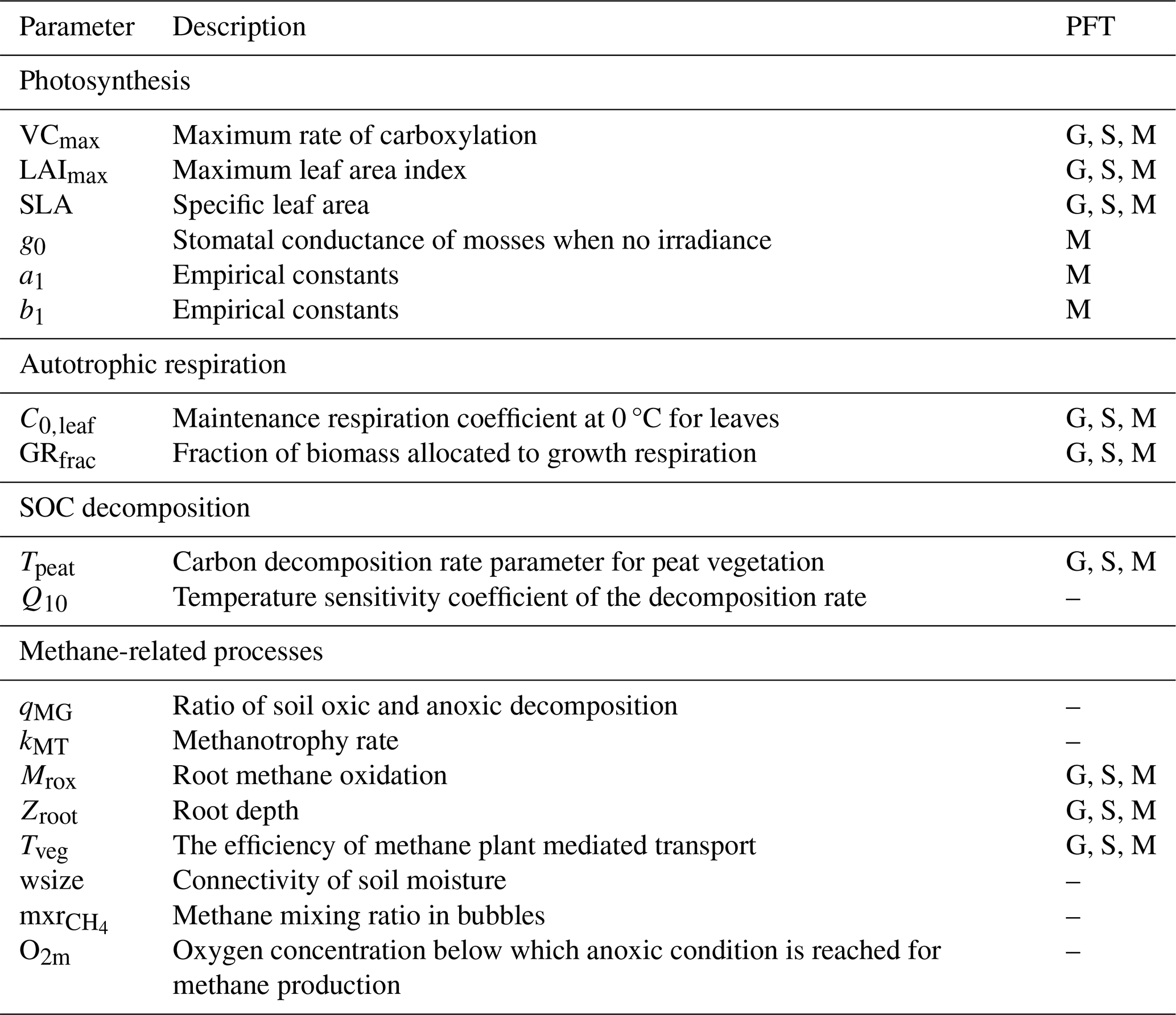 ORCHIDEE-PEAT is a land surface model (https://orchidee.ipsl.fr/, last access: 27 March 2026) with a module specifically developed for peatland. In general, the model comprises two main components: (1) Energy and water balance, and (2) Vegetation and soil carbon cycle. In each model grid cell defining the spatial unit of simulation, the water balance is simulated individually for each soil tile containing a different type of vegetation, while the energy balance is simulated for the whole grid cell (Xi et al., 2024). The soil hydrology is simulated using 11 vertical layers, considering incoming rainfall or snowfall, soil water evaporation, water infiltration in the soil profile every half-hour, surface runoff and drainage (also called subsurface runoff in similar models). One soil tile is specifically designated for peat with distinct soil hydrological parameters. To ensure that this peat soil tile keeps a high water content, bottom drainage is excluded and surface runoff from non-peat soil tiles is given to the peat soil tile at each time step, with a slab water layer that can be created above the peat soil surface of maximum thickness 10 cm. The vegetation and soil carbon cycle component calculates biogeochemical and biophysical variables for each plant function type (called PFT). A peatland tile can contain one or more specific PFTs that grow on it, with the possibility to prescribe a fraction of mosses, graminoids (= grasses + sedges) and shrubs.