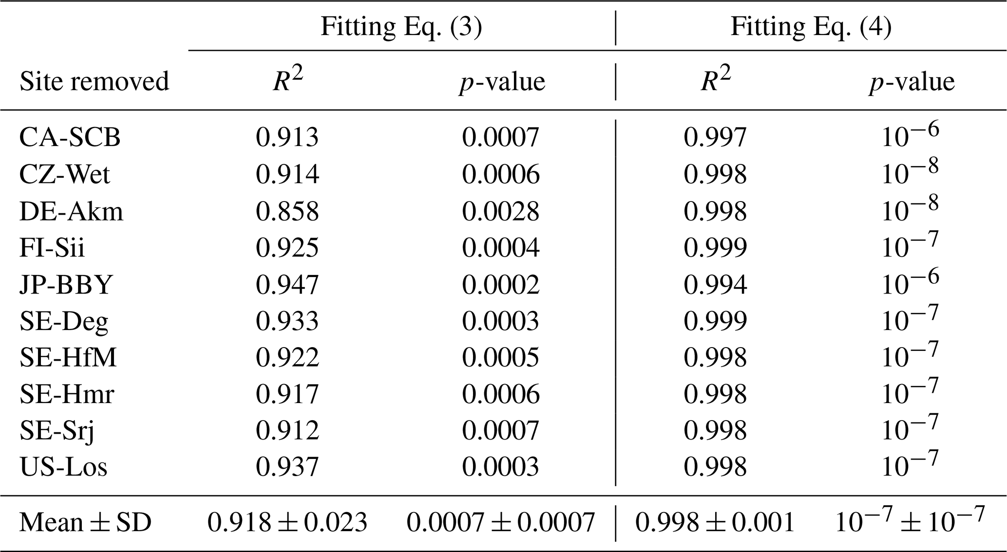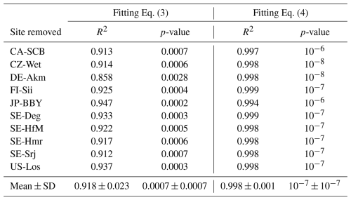 To evaluate the robustness of the selected model, a leave-one-out cross-validation was performed. The model was re-fitted multiple times, each time excluding one site from the data, and the performance metrics (R2 and p-value) were recorded for the withheld site (Table C1). The small variation in R2 (+SD of R2) and p-value (+SD of p-value) among all re-fitted models suggests that the selected regression relationships are internally consistent across sites, within the limits of the available sample.