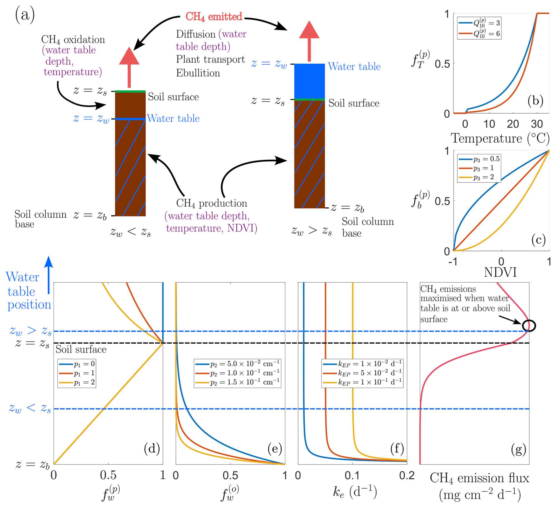 Figure 1Conceptual model structure and environmental controls. (a) Schematic representation of two representative soil columns illustrating contrasting hydrological states: one with the water table below the soil surface (zw<zs) and one under inundated conditions (zw>zs). Purple annotations indicate the assumed environmental controls on CH4 production, oxidation, and emission processes. Panels (b, c) show example functional dependencies used in the model: (b) dimensionless factor that describes temperature dependence of CH4 production, , and (c) dimensionless factor that describes NDVI dependence of CH4 production, , for different parameter choices. Panels (d, f) illustrate dependence on water table position relative to the soil surface: (d) , the CH4 production rate modifier; (e) , the CH4 oxidation rate modifier; and (f) ke, the CH4 emission rate, with two regimes highlighted (zw<zs and zw>zs), these simulations are run for zs=0 cm and cm. Panel (g) presents a schematic of the resulting non-linear dependence of CH4 emission flux on water table depth.