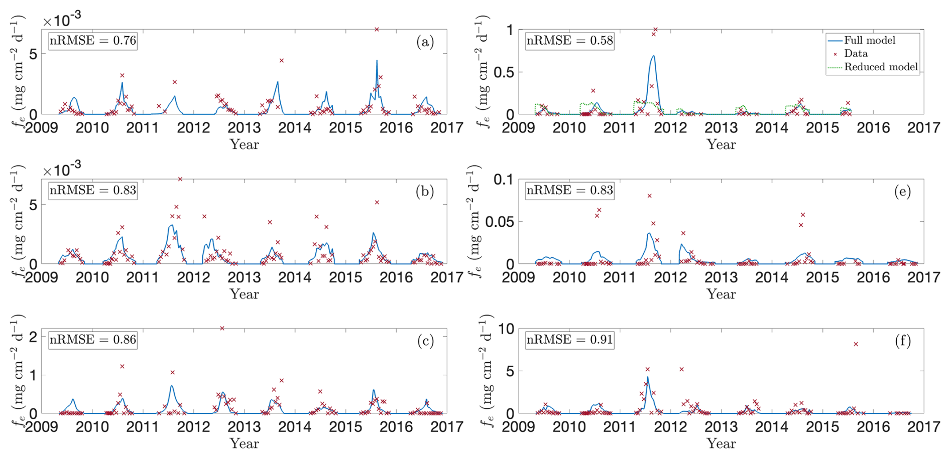 Figure 3Model predictions versus observed CH4 fluxes for selected wetlands in the CLSA. Panels show modelled (blue lines) and observed (red crosses; data from Bansal and Tangen, 2022) growing-season fluxes (2009–2016) for wetlands (a) P1, (b) P3, (c) P8, (d) T5, (e) T6, and (f) T9. These sites were chosen to represent the range of wetland types – permanent, temporary, source, sink, and flow-through. In panel (d), the green line shows predictions without temperature and NDVI dependence, corresponding to the framework of Calabrese et al. (2021).