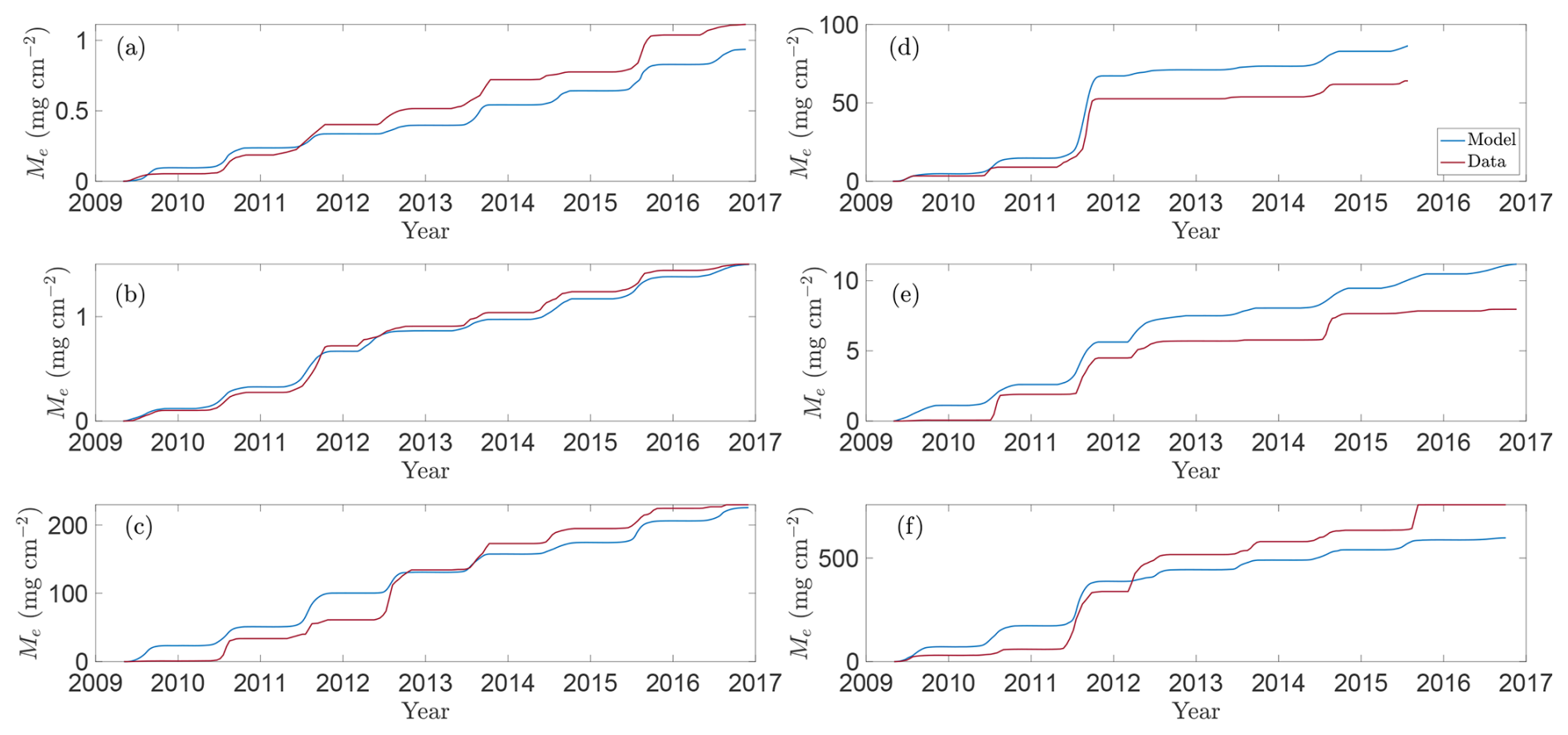 To assess how well the model captures observed emission patterns, Figs. 3 and 4 show baseline simulations using optimised parameters derived using the method described in Sect. 2.5 (see Table A1 for details). In particular, Fig. 3 compares modelled CH4 fluxes (blue line) with observations (red crosses) for the 2009–2016 growing seasons (note that Bansal et al., 2023b, provide data for wetland T5 only through 2015). The corresponding cumulative emissions are presented in Fig. 4, where predicted (blue) and observed (red) totals show close agreement. Panels (a)–(f) correspond to wetlands P1, P3, P8, T5, T6, and T9, respectively, spanning permanent and temporary types and representing a range of hydrological settings (Euliss et al., 2014): three recharge wetlands (P3, T5, T6), one discharge (P1), one flow-through (P8), and one apparently hydrologically isolated site (T9). The full response to modelled environmental drivers are detailed in Sect. S1 in the Supplement.