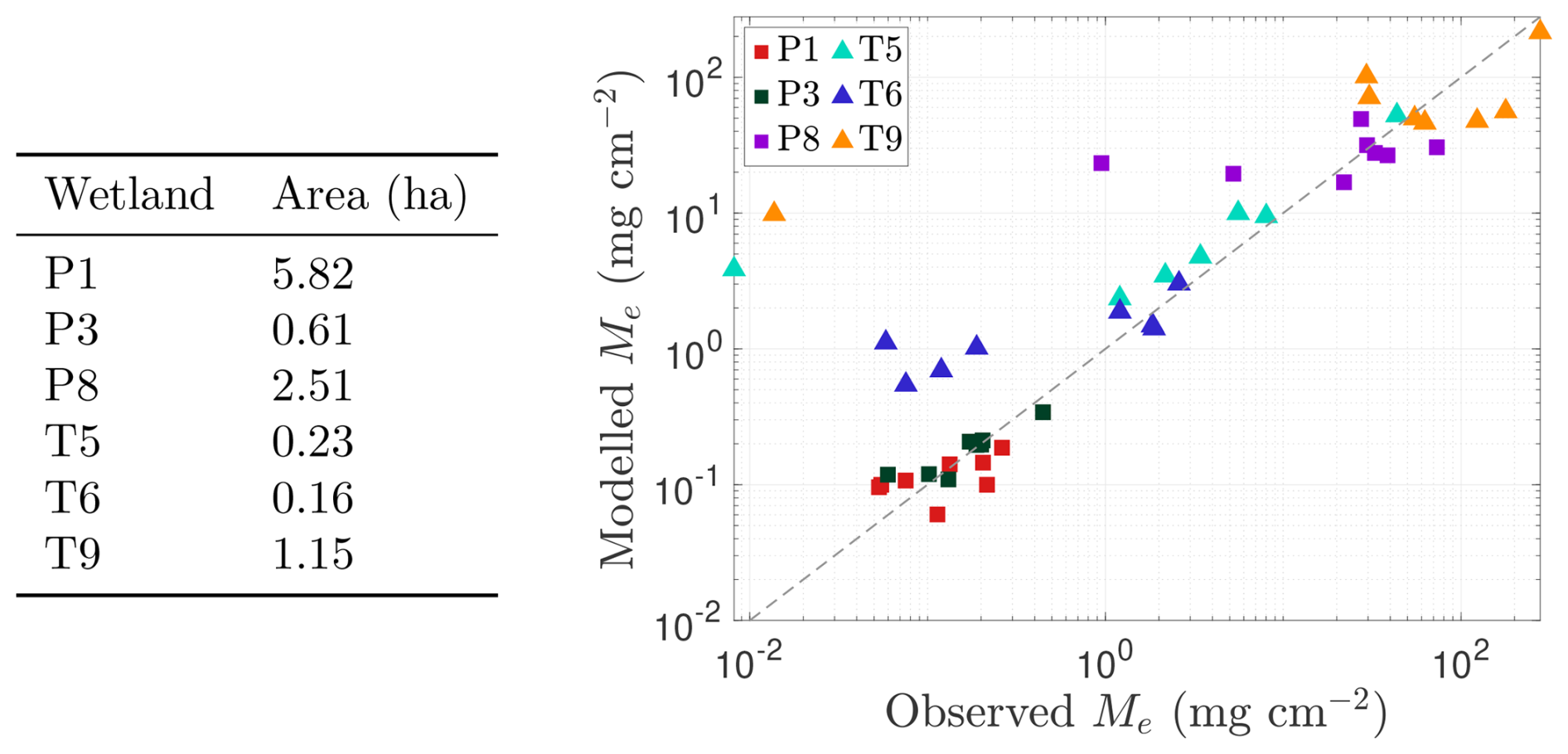 Figure 5Assessment of model performance in capturing methane (CH4) emissions from each wetland (P1, P3, P6, P8, T5, T6, and T9) during the 2009–2016 growing seasons. Scatter plot of approximate total observed emissions (x axis; based on data from Bansal and Tangen, 2022) versus total predicted emissions (y axis) for each wetland in each growing season from 2009 to 2016. Permanent wetlands are indicated with squares and temporary wetlands with triangles. The grey line in both panels represents the line of perfect agreement between observations and predictions. Inundated areas for each wetland are listed in the table on the left.