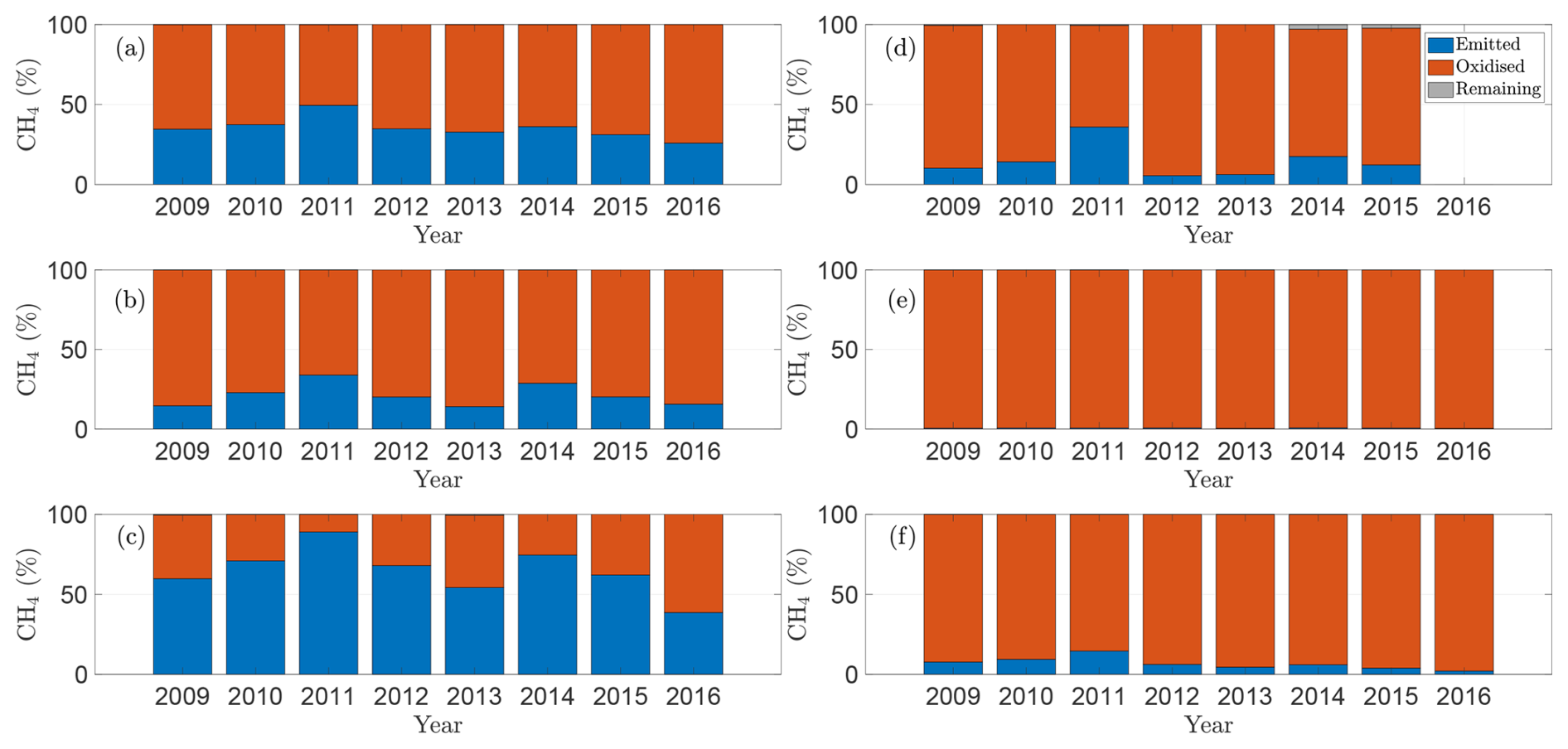 Our model also highlights how the role of oxidation differs between temporary and permanent wetlands. Figure 6 shows, for each wetland – (a) P1, (b) P3, (c) P8, (d) T5, (e) T6, and (f) T9 – the fraction of CH4 produced over a season that is emitted, oxidised, or retained in the soil. As expected, oxidation is more significant in temporary wetlands, where water tables frequently fall below the soil surface, allowing CH4 to be rapidly oxidised before it escapes. In contrast, in permanent wetlands, oxidation is weaker, and in some years, a large fraction of CH4 produced is emitted rather than consumed. This difference reflects how hydrology controls oxygen availability in the soil: lower water tables increase aeration and microbial access, enhancing oxidation, whereas consistently inundated soils remain largely anoxic. These results emphasise that the balance between production and oxidation, which determines net emissions, is highly sensitive to seasonal water-table dynamics, with implications for wetland management and greenhouse-gas mitigation, including the potential role of repeated drainage in oxidising CH4 trapped in the soil column. Moreover, the fraction of CH4 oxidised in the soil column relative to that emitted generally decreases with increasing soil temperature. In most wetlands considered, soil water temperatures peaked in 2011, coinciding with the largest fraction of CH4 emitted. This pattern arises from the weaker Q10-dependence of oxidation compared with production: as temperatures rise, CH4 production increases not only in absolute terms but also relative to oxidation, thereby enhancing net emissions.