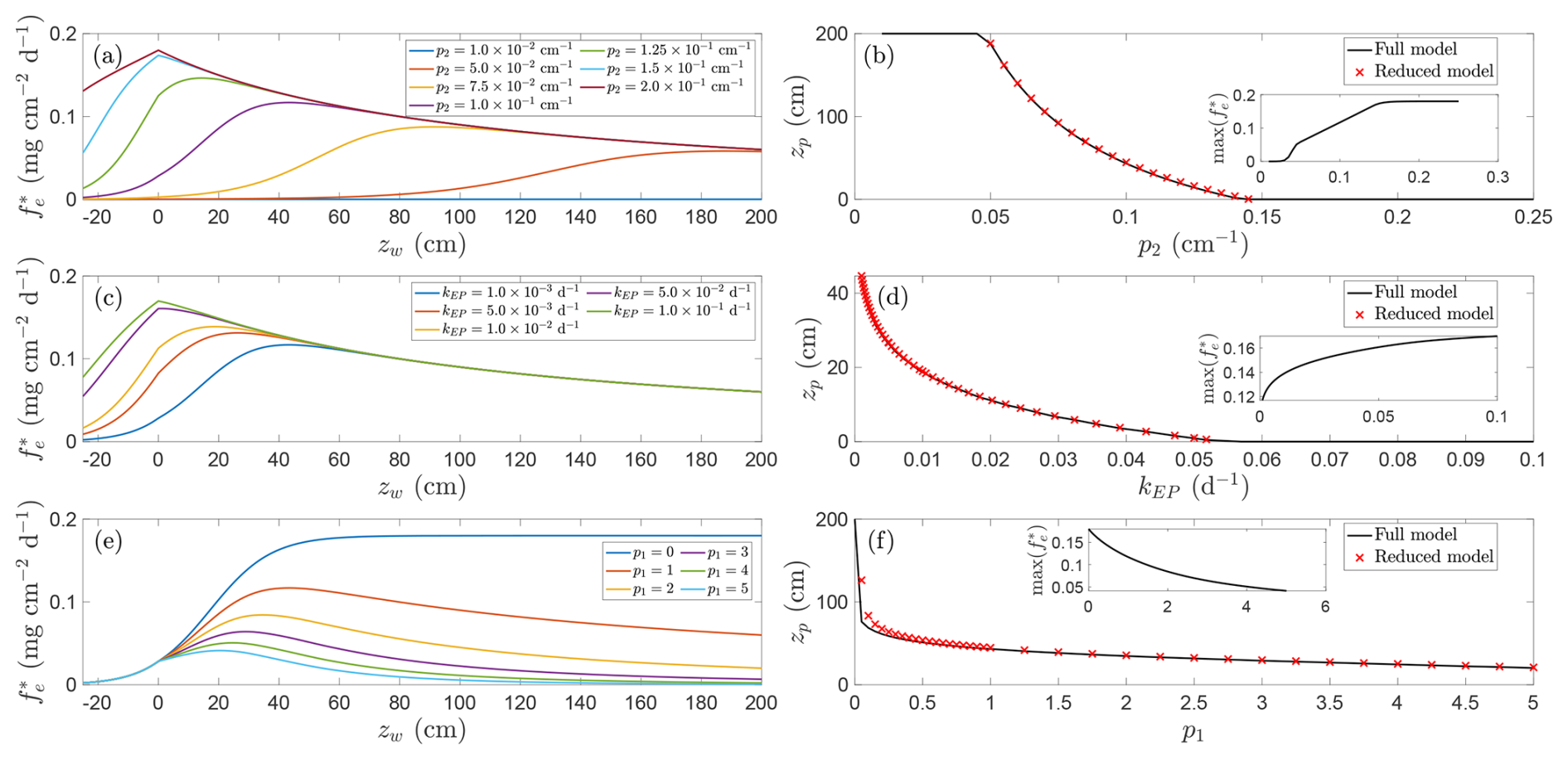 Figure 7Relationship between CH4 emissions and water table depth for different parameter families. Panels (a, b) show effect of varying p2, panels (c, d) show effect of varying kEP and panels (e, f) show effect of varying p1. Left panels (a, c, e) show representative solutions, right panels (b, d, f) show location of emission peak as a function of varied parameter (insets show magnitude of this peak). Red crosses indicate approximation found by solving Eq. (18). Unless otherwise indicated parameters are , p1=1.0, , , Qp=5.0, p3=1, Qo=1.5, , , p5=2.0, T=20 °C, and NDVI=0.8.