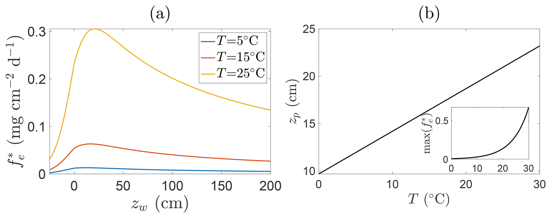 A notable consequence of Eqs. (17) and (18) is that the peak location is itself temperature-dependent via , implying that both the magnitude and position of peak emissions shift throughout the growing season in response to a shifting balance between production and oxidation. Figure 8 illustrates this dependence: panel (a) shows CH4 fluxes at fixed temperatures, whilst panel (b) plots the corresponding peak emission depths and flux magnitudes. As temperature increases, both the intensity of emissions and the depth at which they peak typically rise, shifting the emission maximum further above the soil surface. This behaviour reflects the fact that warming generally amplifies CH4 production throughout the inundated column more strongly than it enhances oxidation (see also Fig. 6), so that the net flux maximum tends to occur at progressively higher positions above the soil surface. However, under some parameter choices, in particular when , the temperature-driven increase in oxidation can instead shift the peak closer to the soil surface. Since this typically occurs only when zw−zb is small and p1 is large, it is usually a weaker effect.