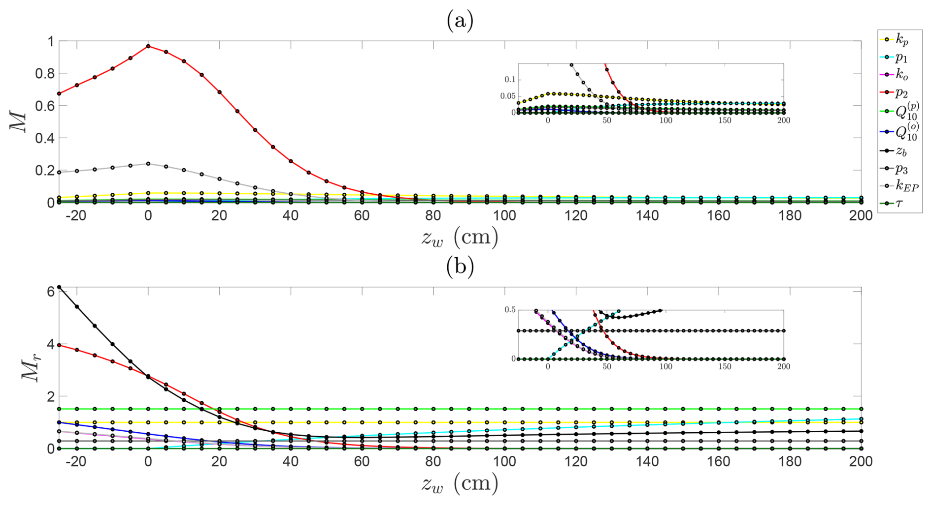 From Eq. (12), clearly depends on the water table depth, soil temperature, and on the wetland-specific parameters. To identify the water depth zp that maximises emissions (for a given set of parameters, temperature, and substrate availability), we solve for the critical point where . In particular, we have