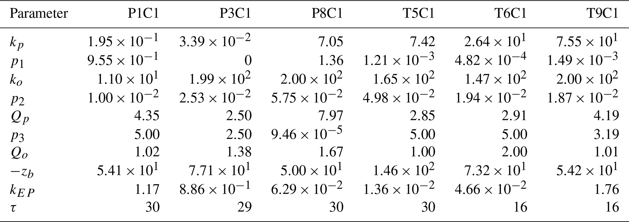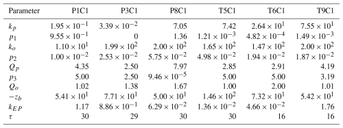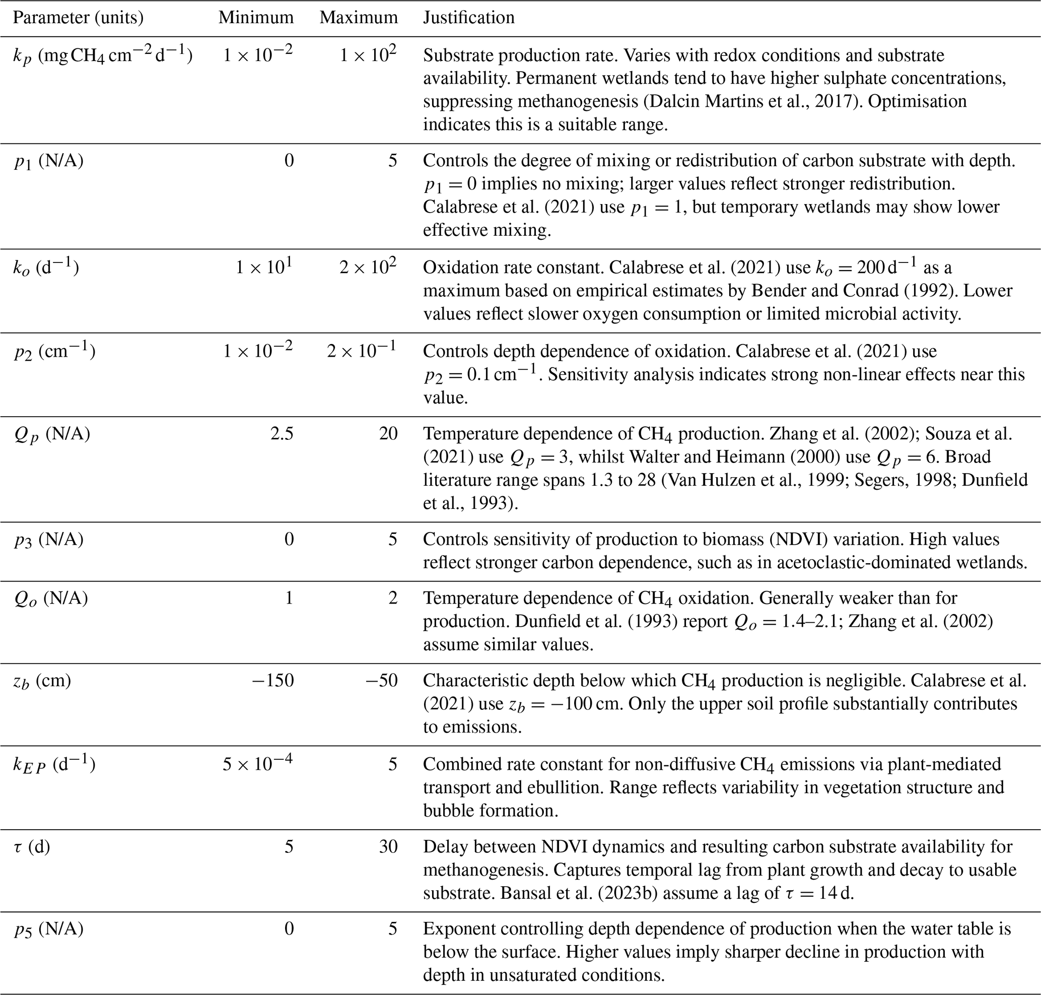 We note that no simple monotonic relationship is evident between fitted parameter values (Table A1) and wetland area or classification (e.g. permanent versus temporary). This is not unexpected, as the calibrated parameters represent effective process rates that integrate multiple interacting controls, including vegetation structure, sediment organic matter quality, hydrological regime, and redox conditions. Consequently, parameter variability primarily reflects site-specific biogeochemical and hydrological heterogeneity.