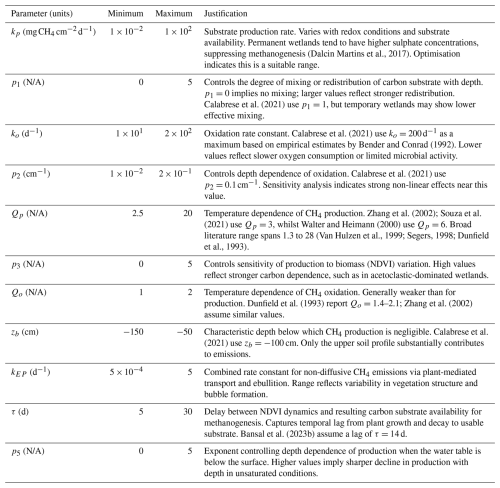 We fit model parameters for each wetland using the dataset provided by Bansal et al. (2023b), which includes data at approximately fortnightly (occasionally coarser) intervals for NDVI, soil temperature, water depth, water-filled pore space (WFPS) at the soil surface and CH4 flux throughout the growing season (April–November). To reduce bias from extreme outliers in CH4 flux measurements, likely caused by ebullition or anthropogenic disturbance, we exclude data points where CH4 fluxes exceed 20 times the interquartile range for each wetland. The possible parameter ranges for each wetland are given in Table A2 in Appendix A, based on an extensive review of the literature. Given our focus on the wetland centre, we use flux measurements from a single chamber located near the centre of each wetland (Chamber 1 in the dataset). Measurements from other wetland or upland chambers are not included in the analysis.